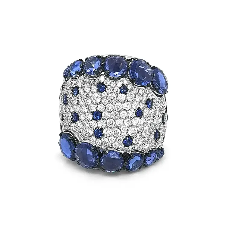 The centerpiece is an ensemble of 44 natural blue sapphires totaling 5.62 ct in round rose cut, sized 1.80–6.40 mm, complemented by one additional natural round sapphire of 1.28 ct. Their saturated color is beautifully balanced by a pavé of natural white diamonds totaling 1.98 ct, round cut, SI clarity, G color. The union of sapphires and diamonds lends dynamism and brilliance, making the ring a symbol of luxury, originality, and exceptional style.