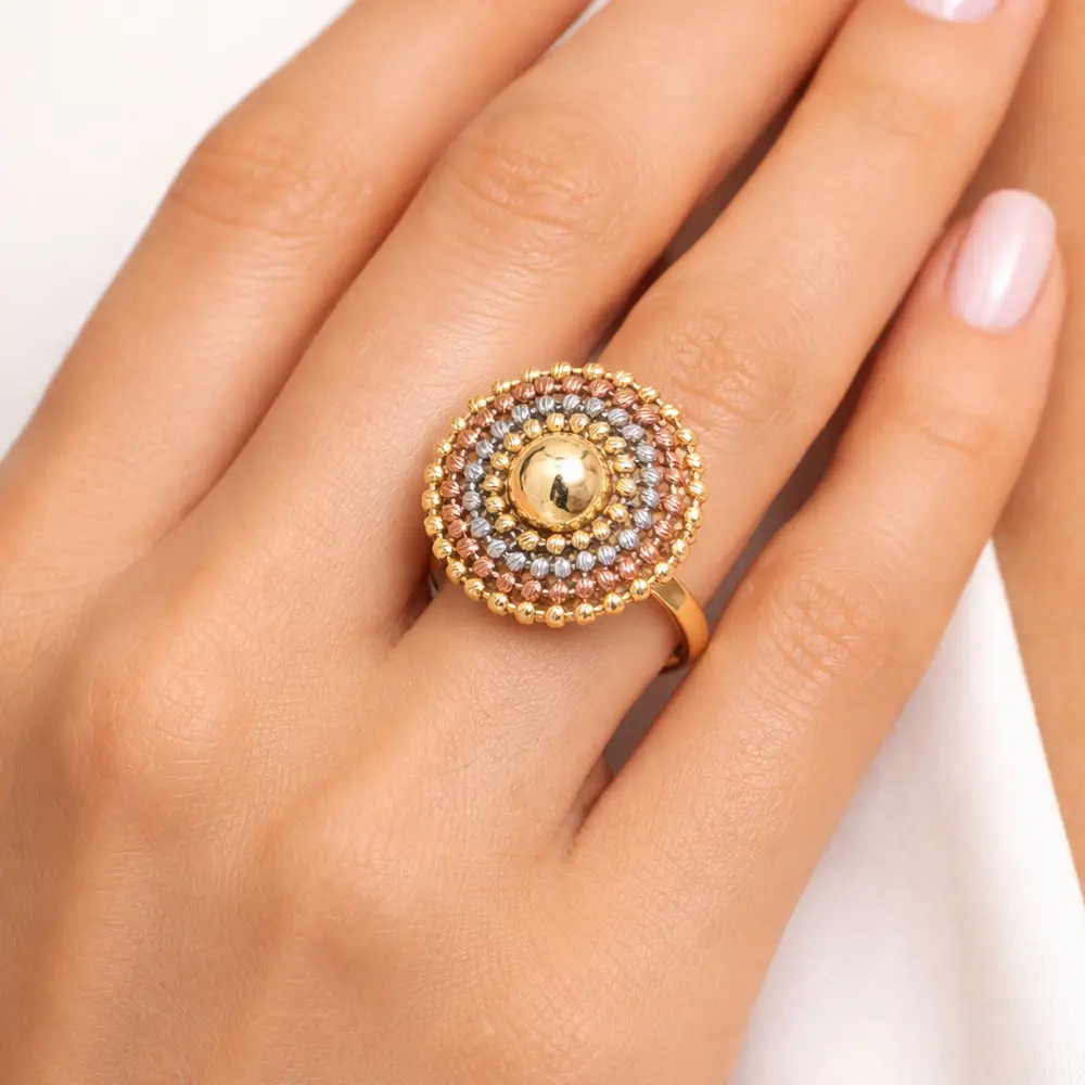 This striking ring masterfully combines yellow, white, and rose 14k gold, crafted into a richly textured circular motif. The smooth central dome is surrounded by multiple rows of delicate granulated details, creating a beautiful dimensional effect that catches the light. The ring resembles an elegant mosaic and instantly stands out on the hand.