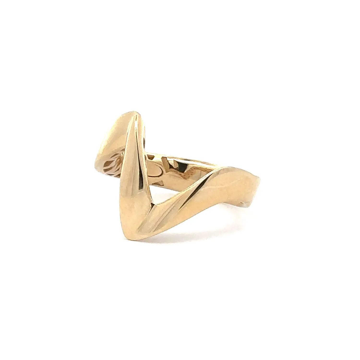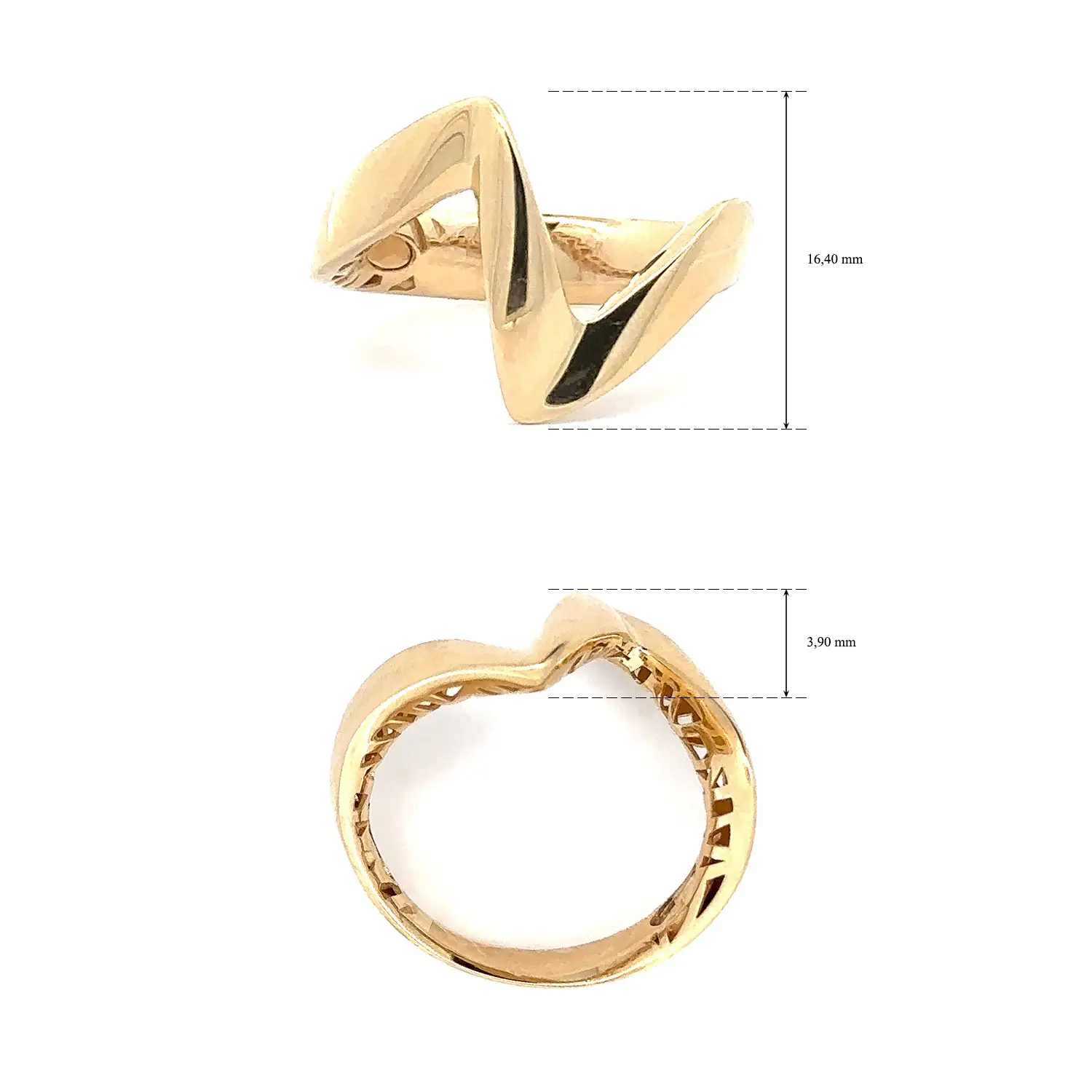 This striking ring stands out with its asymmetrical geometric form, creating an elegant line composed of both sharp and smooth transitions. The high-polished yellow gold enhances its contemporary character and highlights the dynamic silhouette that sets it apart from traditional ring designs. Its distinctive shape carries a touch of architectural flair, giving the piece a bold and modern expression.