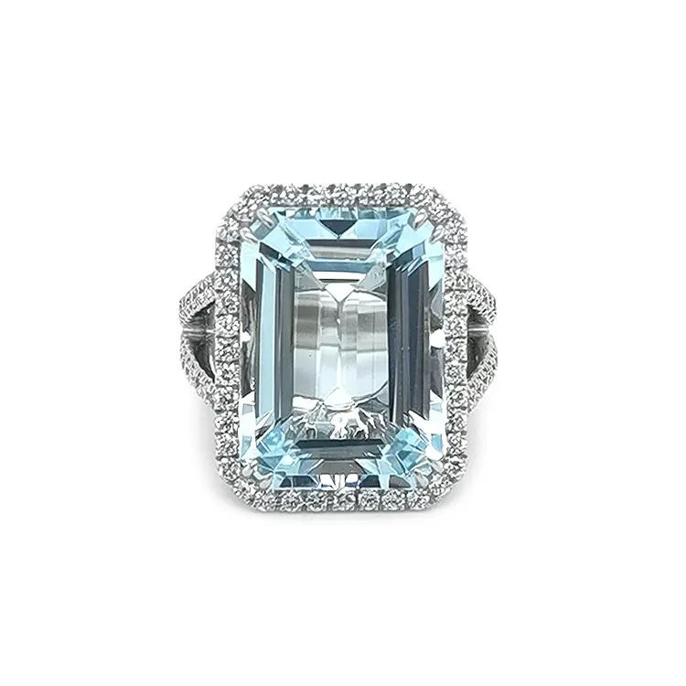 At the center is a natural aquamarine, 14.22 ct (1 pc), emerald cut (18.80 × 12.85 mm), pure blue. Sparkle and contrast come from a pavé of natural diamonds, 0.95 ct (80 pcs), round cut (Ø 1.20 mm), white, SI clarity, G color. The precise setting highlights the aquamarine’s depth and the diamonds’ brilliance—resulting in a luxurious, timeless, and truly striking ring for exceptional occasions.