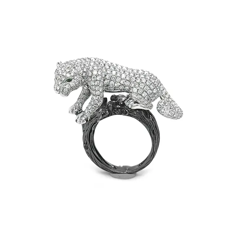 The composition is completed by two natural round emeralds, each 1.50 mm, totalling 0.03 ct, adding a subtle touch of colour. Their gentle green hue contrasts beautifully with the white diamonds, enhancing the individuality and elegance of the design. This ring is perfect for a woman who appreciates luxury, detail, and a confident, expressive style.