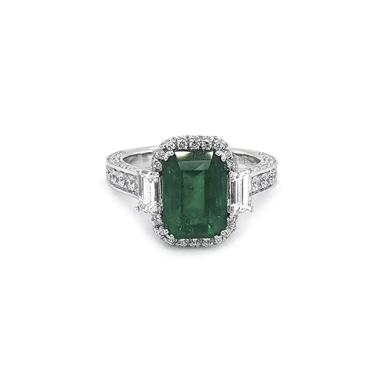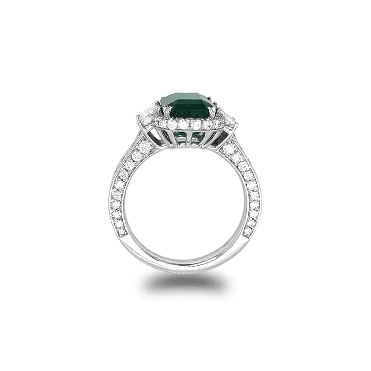 At its heart lies a natural 3.11 ct emerald in a precise Emerald cut (10.35 × 7.34 mm), radiating vibrant green tones that symbolise vitality, depth and harmony. Flanked by two baguette-cut diamonds (0.67 ct) and surrounded by 74 round brilliant diamonds (1.08 ct, colour F-G, clarity VS), it creates a breathtaking interplay of sparkle and sophistication.