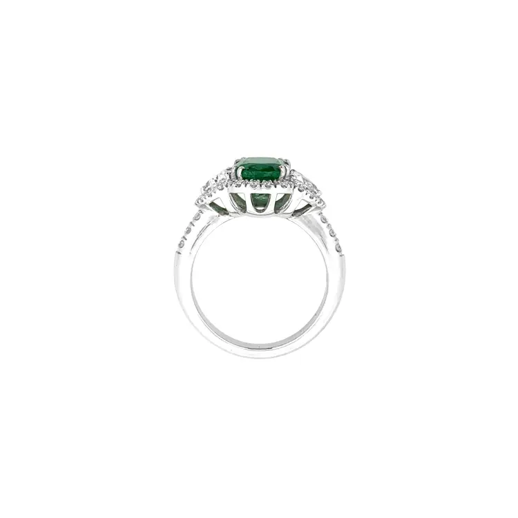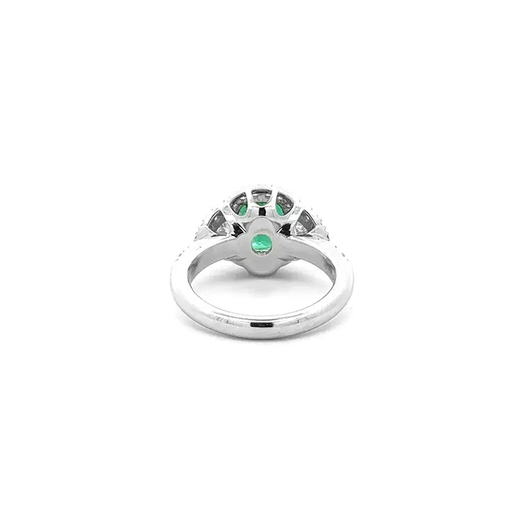 Flanking the main gemstone are two trilliant-cut diamonds (0.47 ct total) and round diamonds (0.44 ct total, colour G), all expertly set to create a refined play of light and movement. The contrast between the vivid green emerald and the brilliant diamonds set in white gold delivers a sophisticated yet understated prestige.