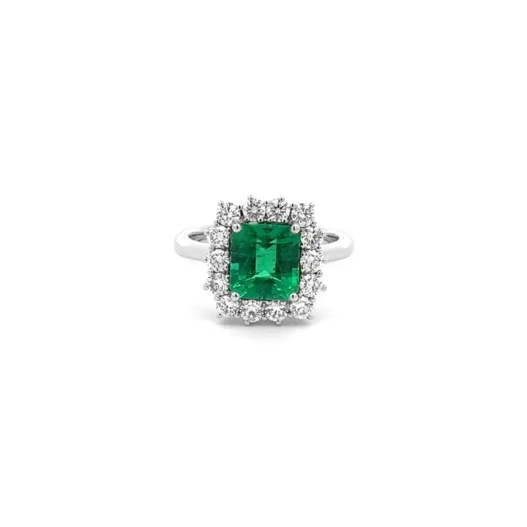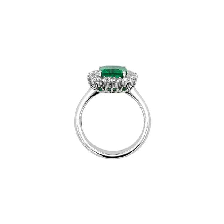 Flanking the central gemstone is a selection of round diamonds totalling 0.90 ct (colour G, clarity VS) that frame the emerald and add luminosity and movement. The striking contrast between the lively green gem and the pristine white gold creates a sense of subtle extravagance while remaining timeless.