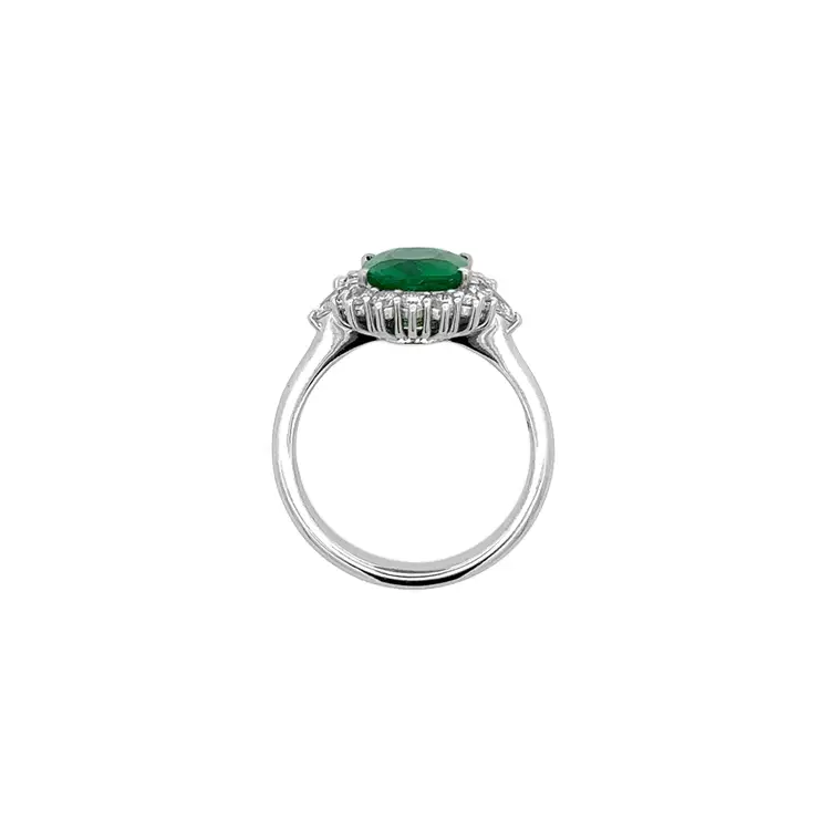 The Beny Jewellery emerald and diamond ring embodies refined elegance and natural radiance. Crafted from 18 kt (750/1000) polished white gold, it unites classic artistry with modern grace. At its center lies a natural 1.86 ct emerald, cushion-cut to reveal its vibrant green tone — a color that evokes harmony, renewal, and timeless beauty.