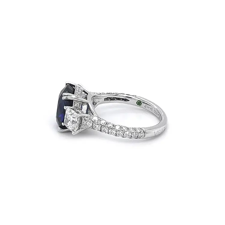 At its core lies a natural 5.57 ct sapphire, cushion-cut (10.60 × 9.64 mm), whose deep royal blue hue embodies serenity, grace and timeless beauty. On each side shimmer two cushion-cut diamonds (1.40 ct total, colour E, clarity VVS1), of near-flawless brilliance, while 64 round diamonds (0.72 ct total, colour F–G) encircle the setting in a halo of pure light.