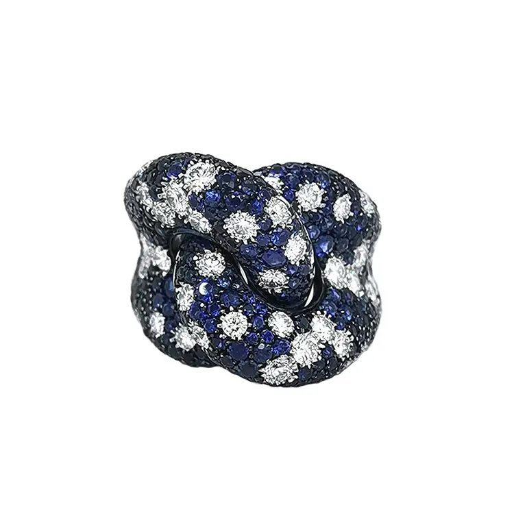 At the center is a natural blue sapphire, 4.20 ct, round cut, whose saturated hue lends depth and allure. The striking centerpiece is complemented by a pavé of 36 natural white diamonds totaling 1.70 ct, round cut (Ø 3.20 mm), SI clarity, G color. Precise setting and the sapphire–diamond contrast emphasize the noble character of the piece, perfectly finishing an evening look and highlighting the wearer’s bold, sophisticated, and luxurious style.
