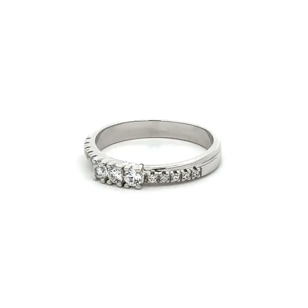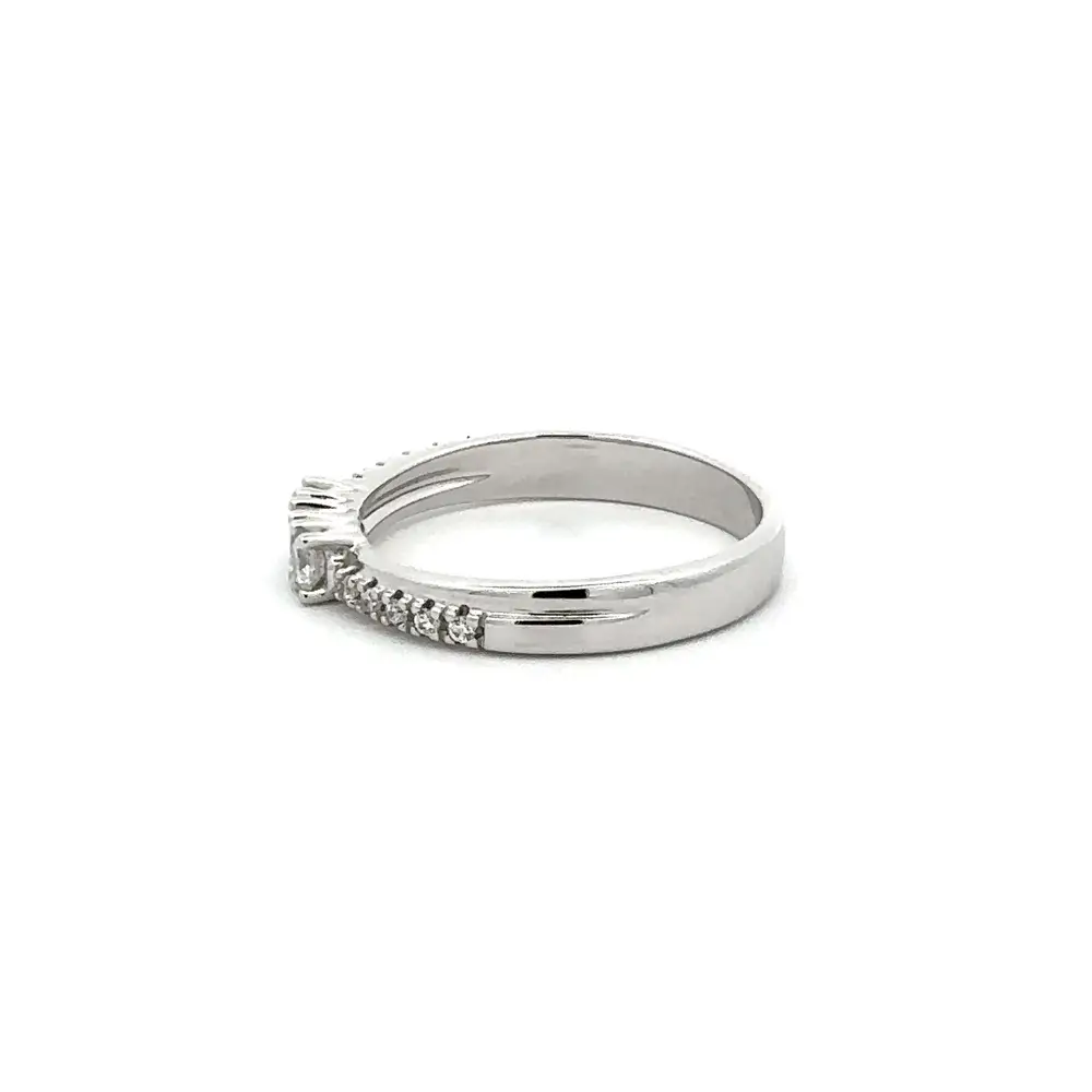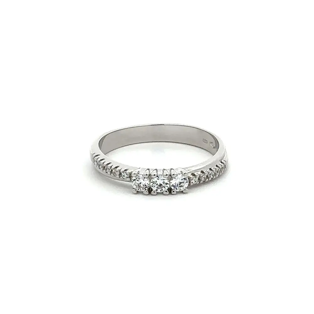 Small zircon stones set along the sides gently continue the design and enhance the overall brilliance without appearing overpowering. The slim band ensures comfortable wear and highlights the light, refined character of the ring. This piece is an ideal choice for women seeking elegant jewelry with a soft sparkle and universal appeal for both everyday wear and special occasions.