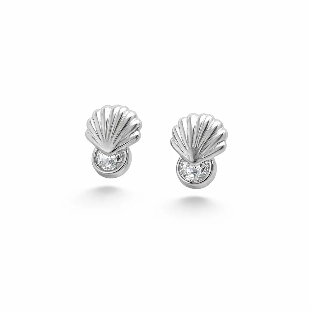 These gold shell-motif earrings combine delicate elegance with inspiration drawn from the sea. The sculpted shell surface creates a refined play of light, while the brilliant-cut zircon set beneath adds sparkle and a sophisticated contrast. The design is subtle yet distinctive, offering a timeless aesthetic.