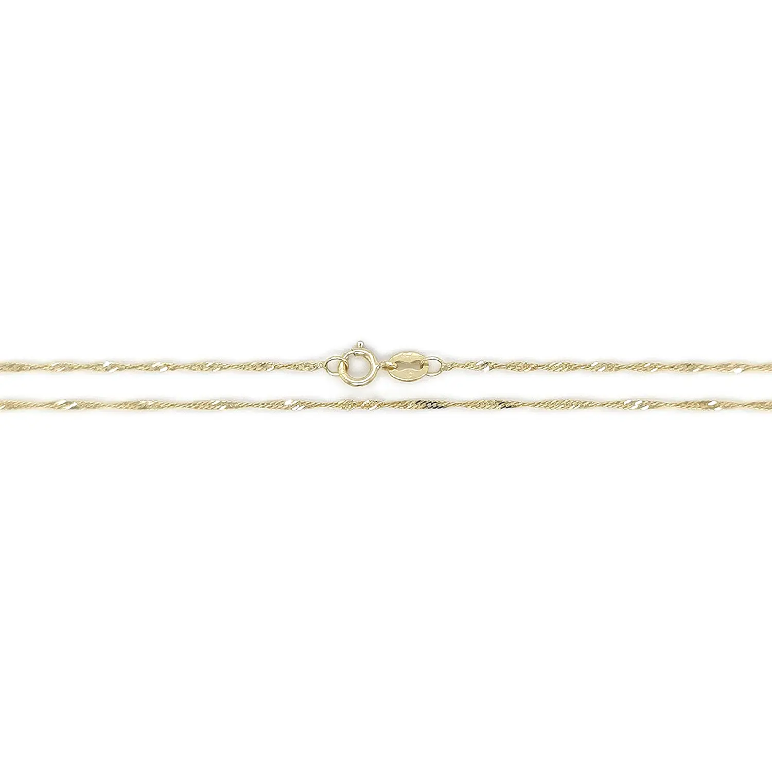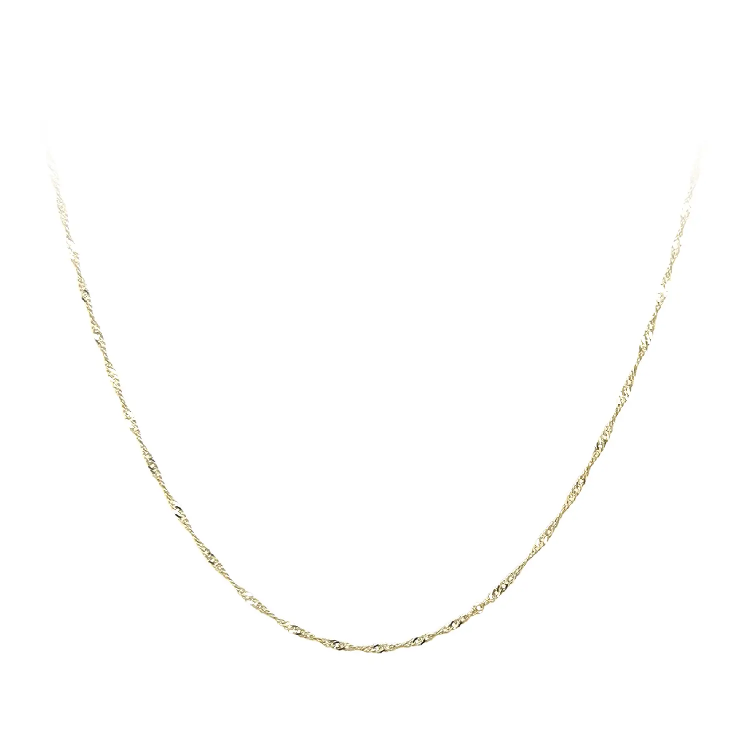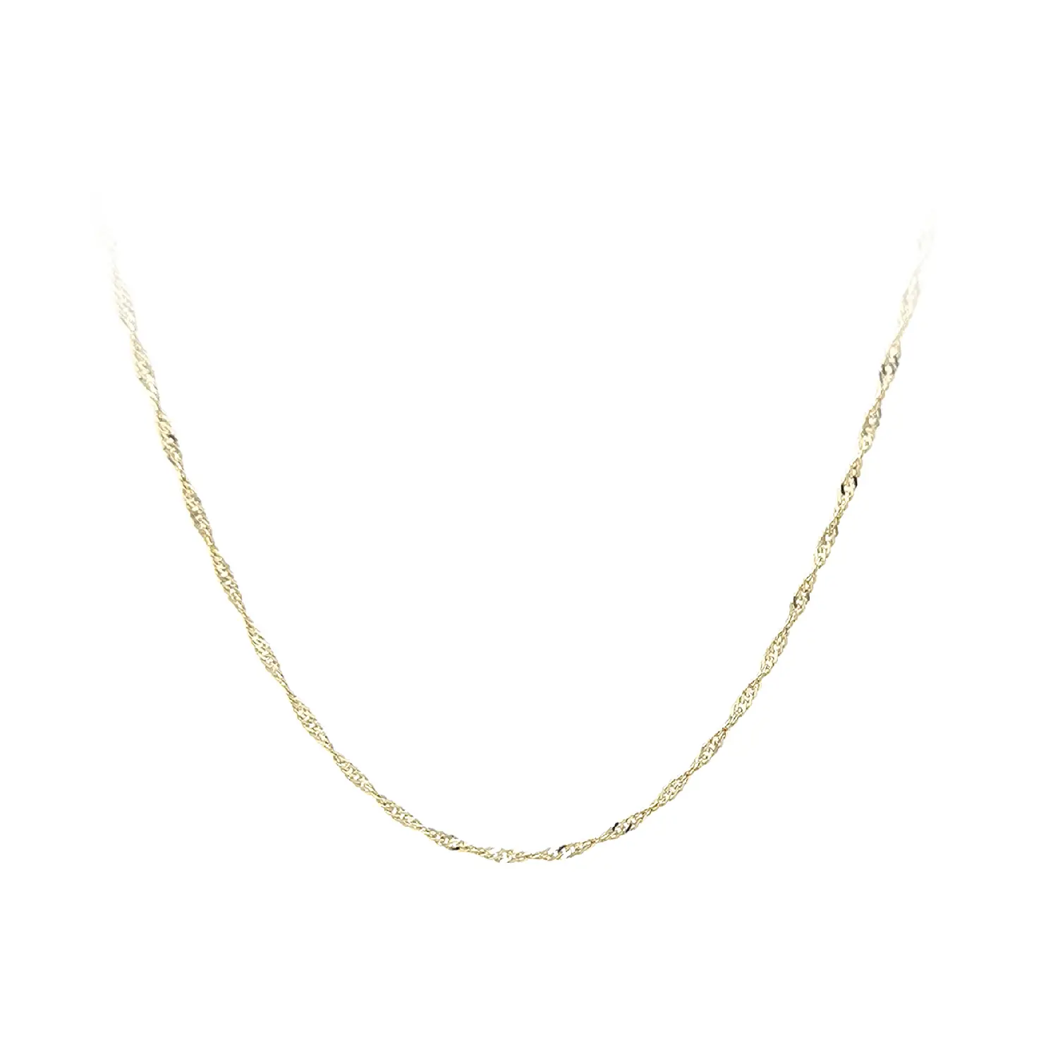 A gold chain in the Singapore pattern features a delicately twisted spiral design that reflects light beautifully and gives the chain a refined, elegant shine. This lightweight and sophisticated style is perfect for everyday wear as well as more formal occasions.