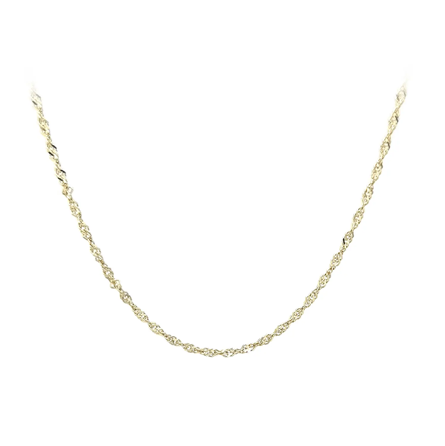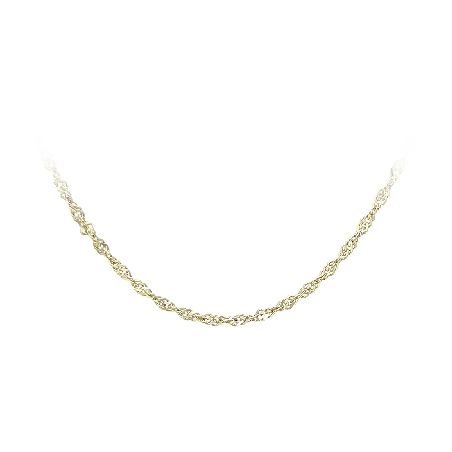 The gold Singapore chain features a finely twisted design that creates an elegant look and beautifully reflects light. With a width of 1.50 mm, it appears delicate while maintaining a refined shine and precise craftsmanship.