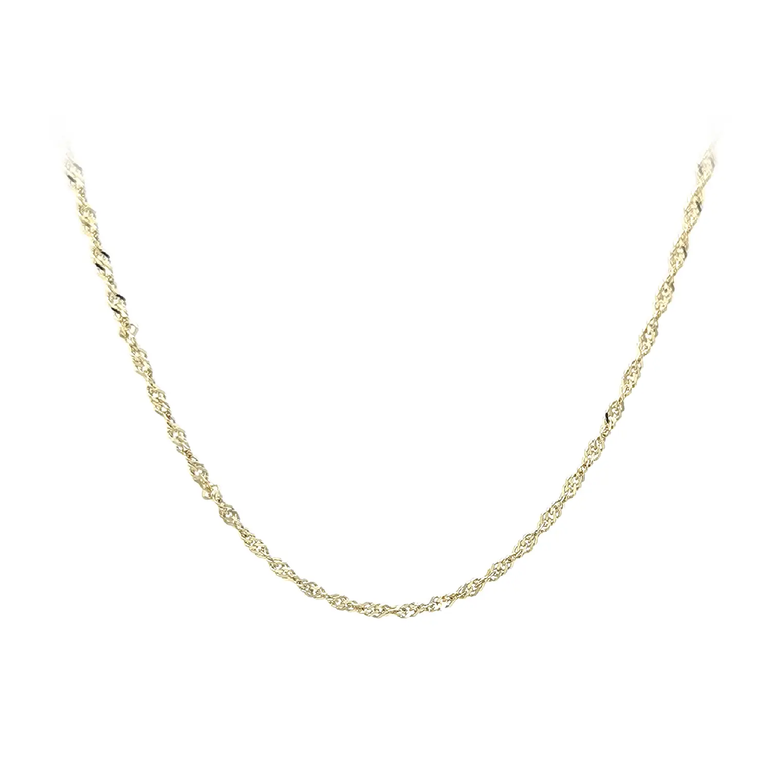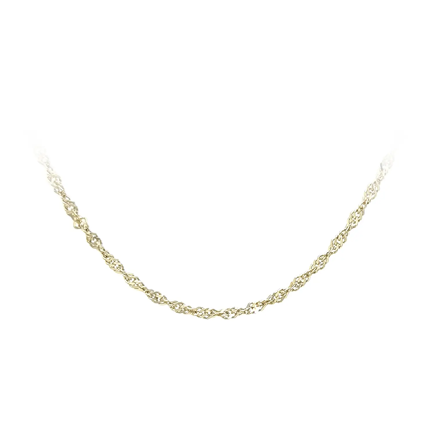 The gold Singapore chain stands out with its finely twisted design, which creates an elegant play of light and gives the jewelry a refined yet subtle character. The precisely crafted links feel light and airy, making the chain suitable for wearing on its own or combined with a pendant.