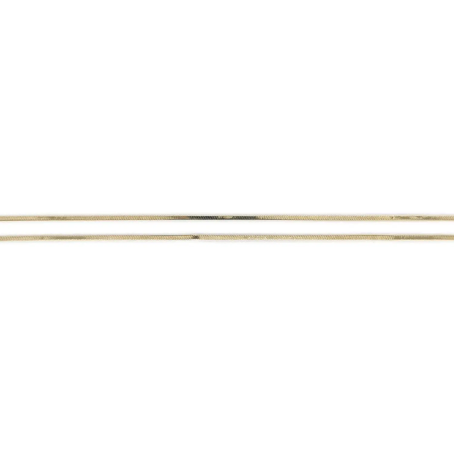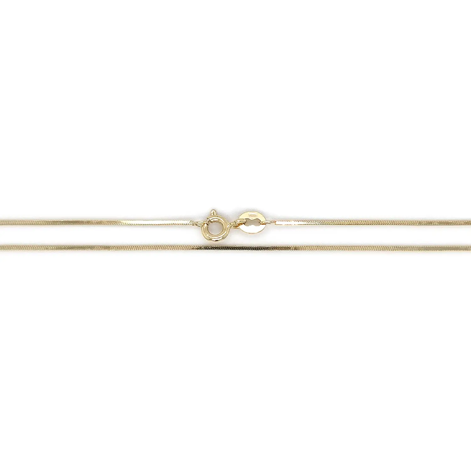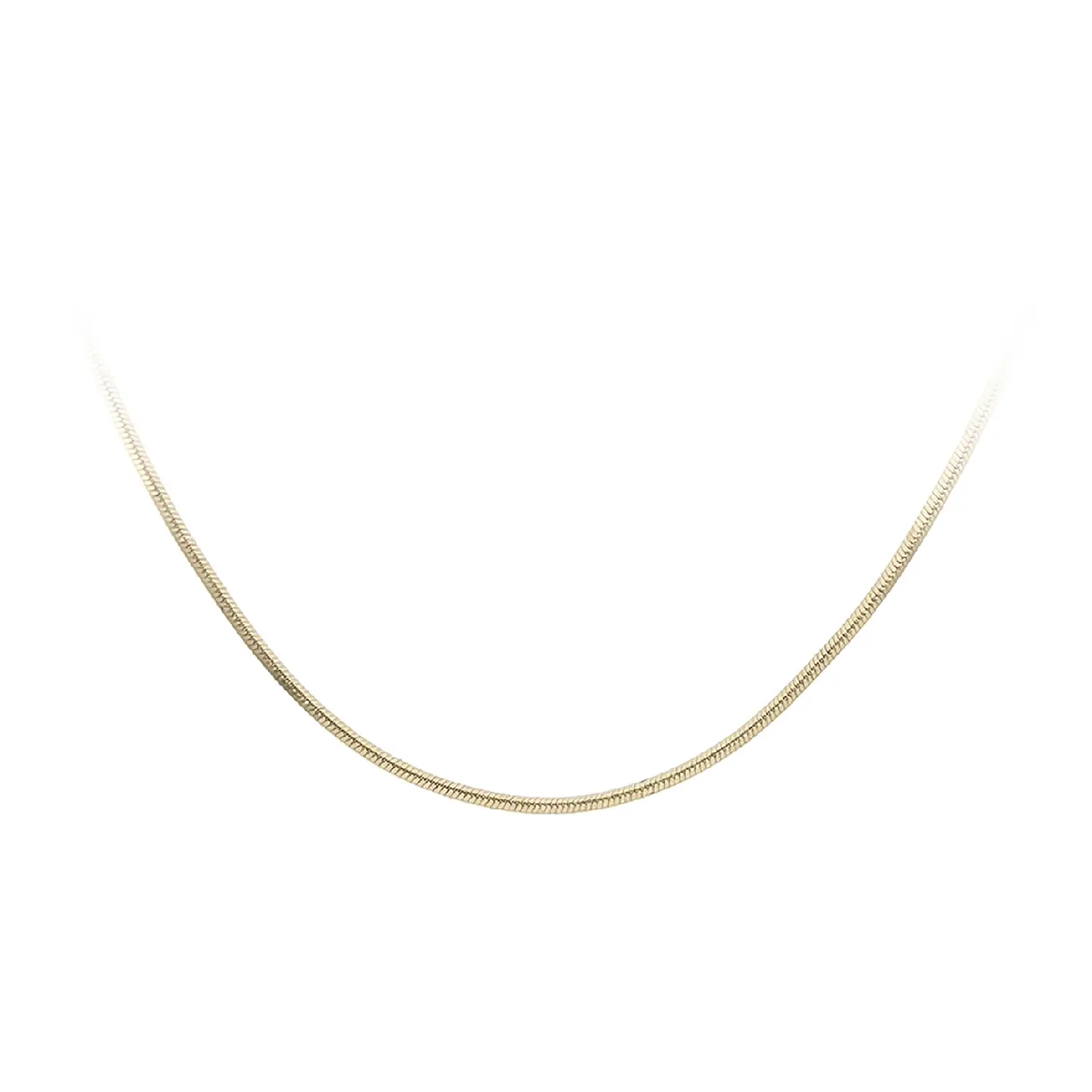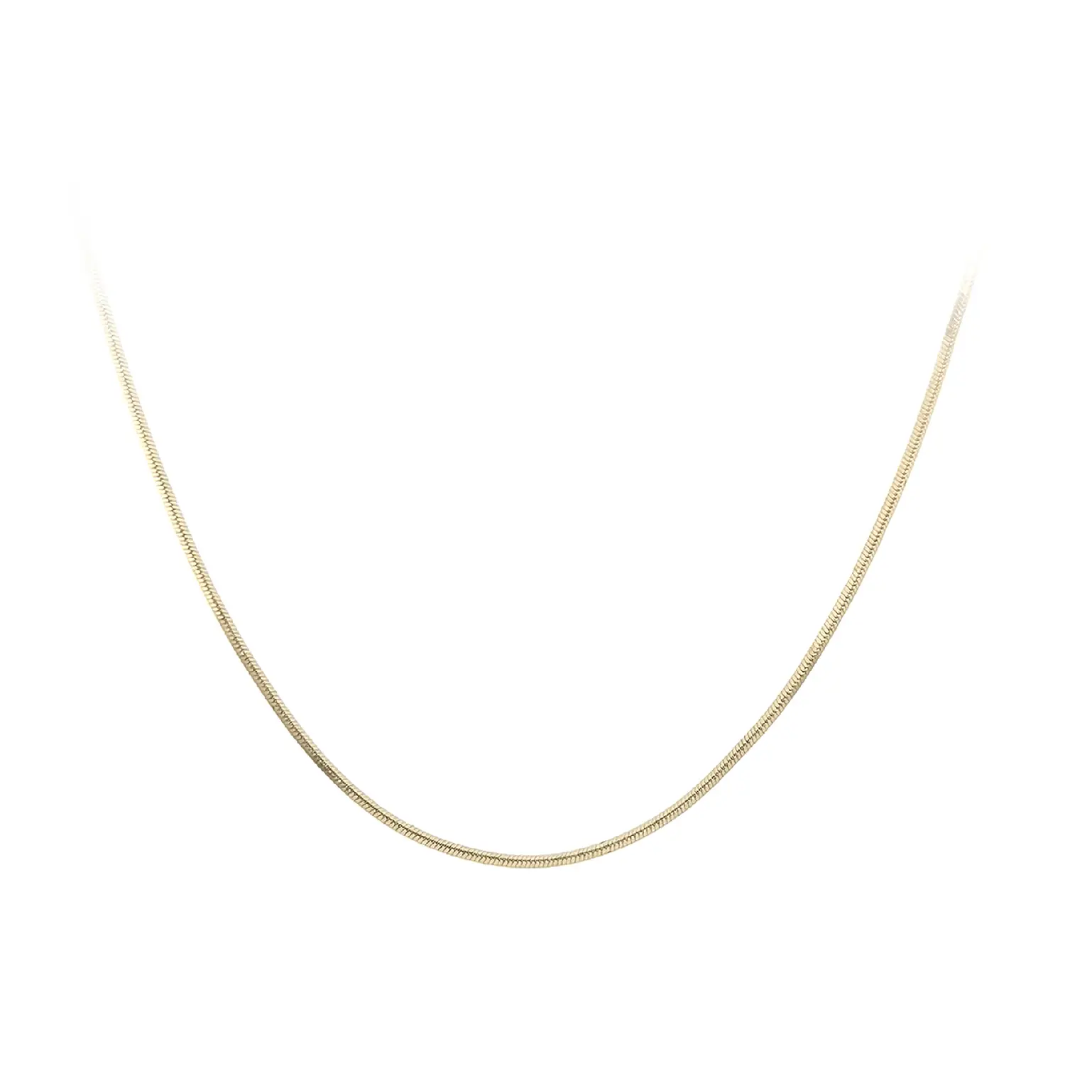 This gold snake chain features a smooth, compact surface with an elegant shine, giving it a clean and timeless appearance. Its delicate profile makes it perfect for wearing on its own or as a base for a pendant.