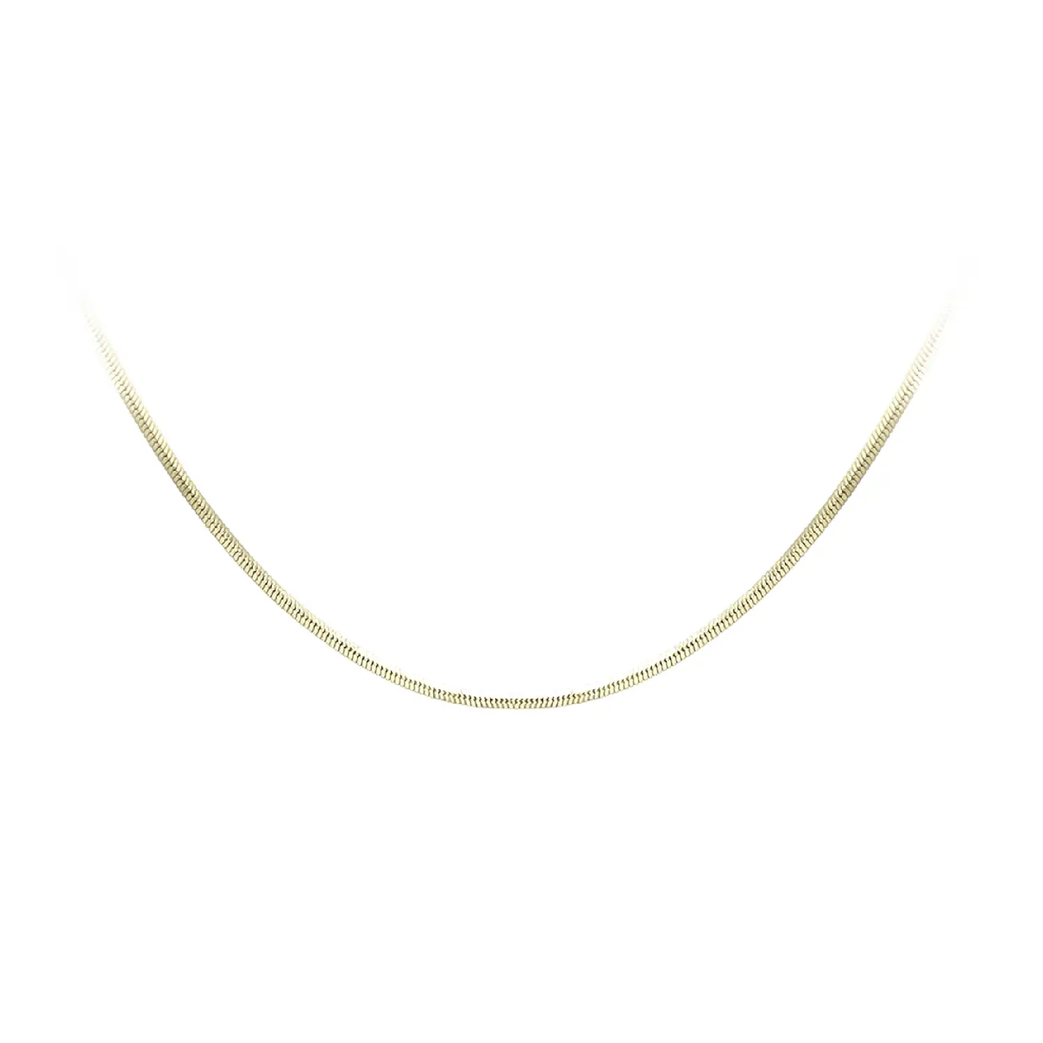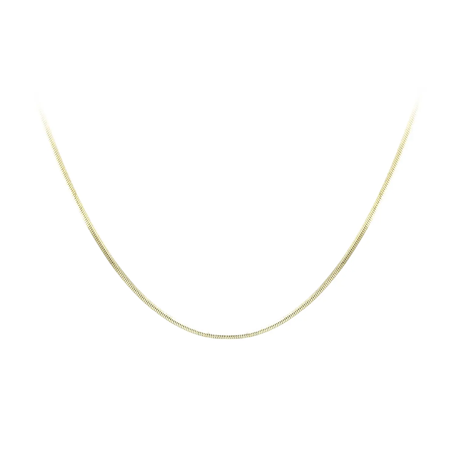 This elegant gold snake chain features a smooth, continuous structure with a refined shine that naturally follows the neckline. Its minimalist design appears clean and timeless, making it ideal for wearing on its own or paired with a delicate pendant.