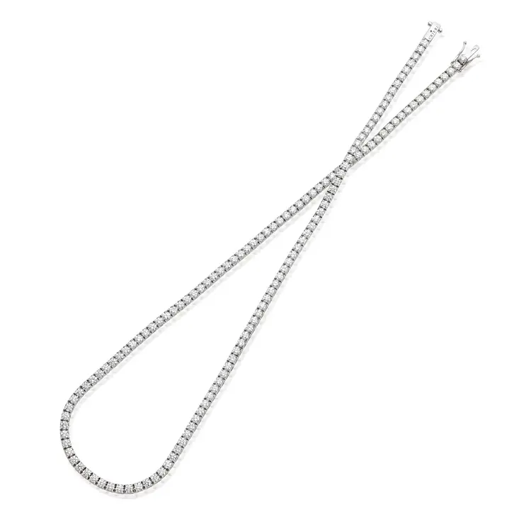 The necklace is adorned with natural white round-cut diamonds totaling 6.00 carats, graded G–H in colour and VS in clarity. Each stone is meticulously hand-set to create a seamless sparkle that highlights the brand’s passion for precision and elegance. The result is a piece that captures both light and attention effortlessly.