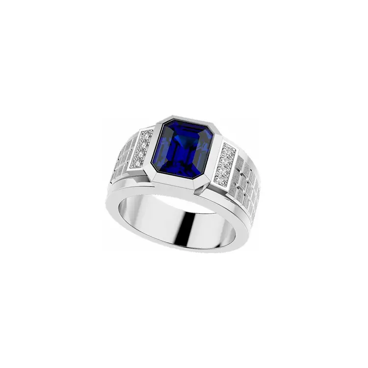 At center is the main stone—sapphire (1 stone) 4.49 ct, Emerald cut / Emerald, deep blue (origin: natural). Added sparkle and contrast come from diamonds (8 stones), round cut / Round, white (origin: natural), which enhance the sapphire’s saturation and the ring’s architecture. The result is a timeless, striking, and elegant men’s ring that clearly expresses the wearer’s personal style.