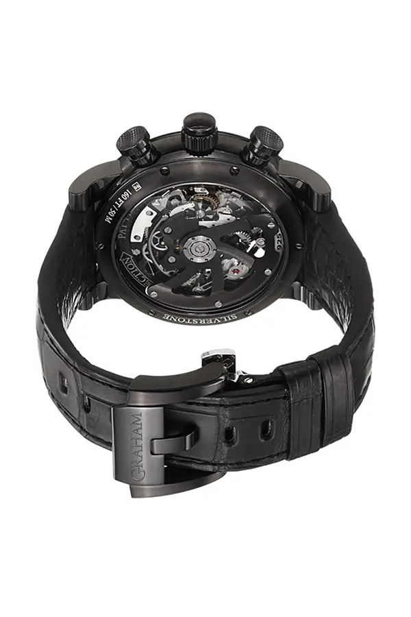 The Graham Silverstone Tourbillograph is an exceptional model that embodies technical perfection, bold design, and top craftsmanship. Its round case with an impressive diameter of 48 mm is made of steel with black PVD coating, highlighting the sporty and dynamic character of this model. The steel bezel with black PVD finish harmoniously matches the overall design.