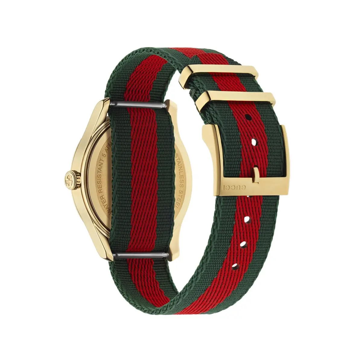 Gucci G-Timeless Contemporary YA126487B is a striking model that blends modern aesthetics with the brand’s iconic details. On the wrist, it features a 38 mm round case in stainless steel / yellow-gold plating, a matching bezel in steel / yellow-gold plating, and a sapphire crystal. The look is completed by a bicolor analog dial and a bicolor textile strap with a pin buckle, giving the watch a fresh, stylish presence from morning to night.