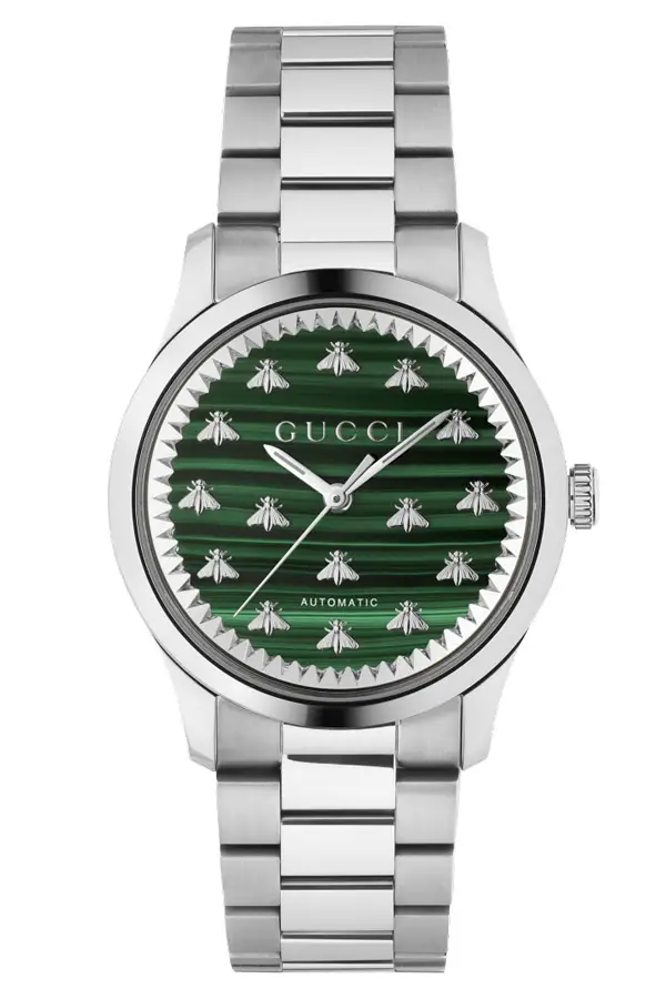 The Gucci G-Timeless Multibee watch embodies luxury, Italian elegance, and Swiss precision, making it a striking accessory for any modern man. Its malachite-green dial is adorned with 15 intricately crafted silver bees, one of Gucci’s iconic symbols, representing both artistry and identity.