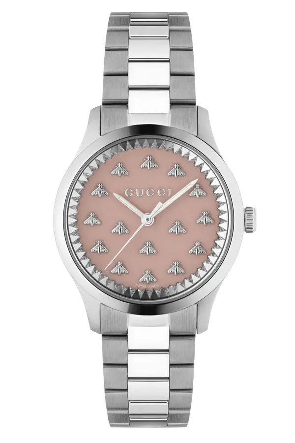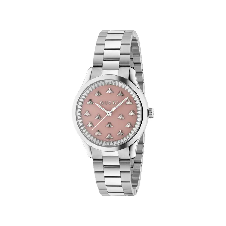 Gucci G-Timeless Multibee YA1265033 is an elegant model that blends modern aesthetics with the brand’s iconic signature. On the wrist it features a 32 mm round case in stainless steel, protected by a sapphire crystal, paired with a clean stainless-steel bezel. A fresh touch comes from the pink analog dial, harmonizing with the stainless-steel bracelet (silver tone) with a folding clasp—a timeless combination for everyday wear.
