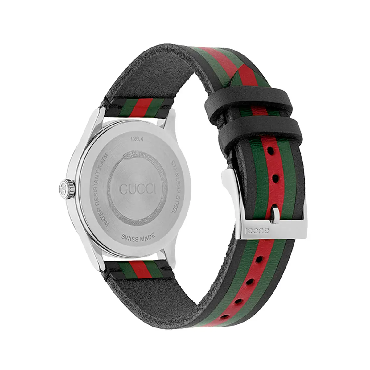 Care-free timekeeping comes from a quartz movement, while water resistance 5 ATM / 50 m provides confidence for routine contact with water. Comfort and style are enhanced by a bicolor leather strap with a pin buckle. Gucci G-Timeless YA1264079 is a great choice for those seeking a stylish, versatile, and reliable watch with modern elegance.