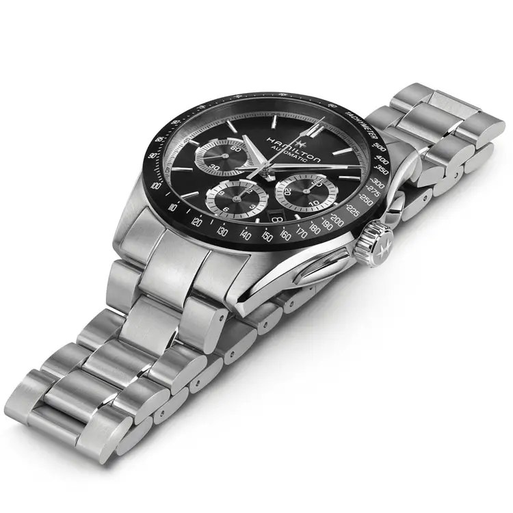 Beneath the black sporty-elegant dial beats a mechanical automatic movement, ensuring smooth and precise performance. The watch also features a date display and a chronograph for measuring shorter time intervals. Every detail reflects Hamilton’s commitment to quality, innovation, and technical excellence.