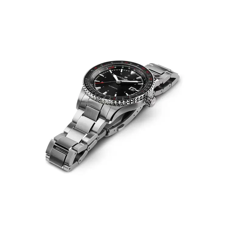 The watch features a striking black analog dial with a date display at 3 o’clock. A scratch-resistant sapphire crystal ensures perfect readability in all conditions. At its core ticks the reliable automatic H-10 movement with an impressive power reserve of up to 80 hours, ideal for those who alternate watches.
