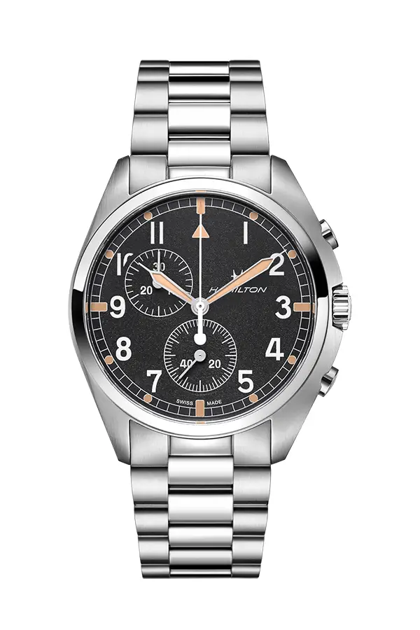 Khaki Aviation is Hamilton's collection that pays homage to the brand's aviation roots and its collaboration with pilots and the military. This line is inspired by 20th century navigation watches for pilots, but brings them to life in a modern, technically advanced design.