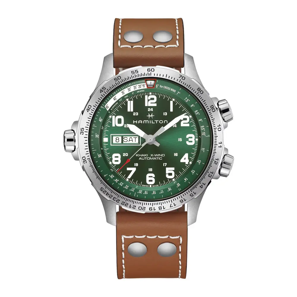 Powered by a reliable automatic movement (caliber H-30), the watch offers an impressive power reserve of up to 80 hours and does not require a battery. It features hours, minutes, seconds, day-date display, and a crosswind calculator for aviation use. The 100 m water resistance and screw-down crown ensure durability during active use.