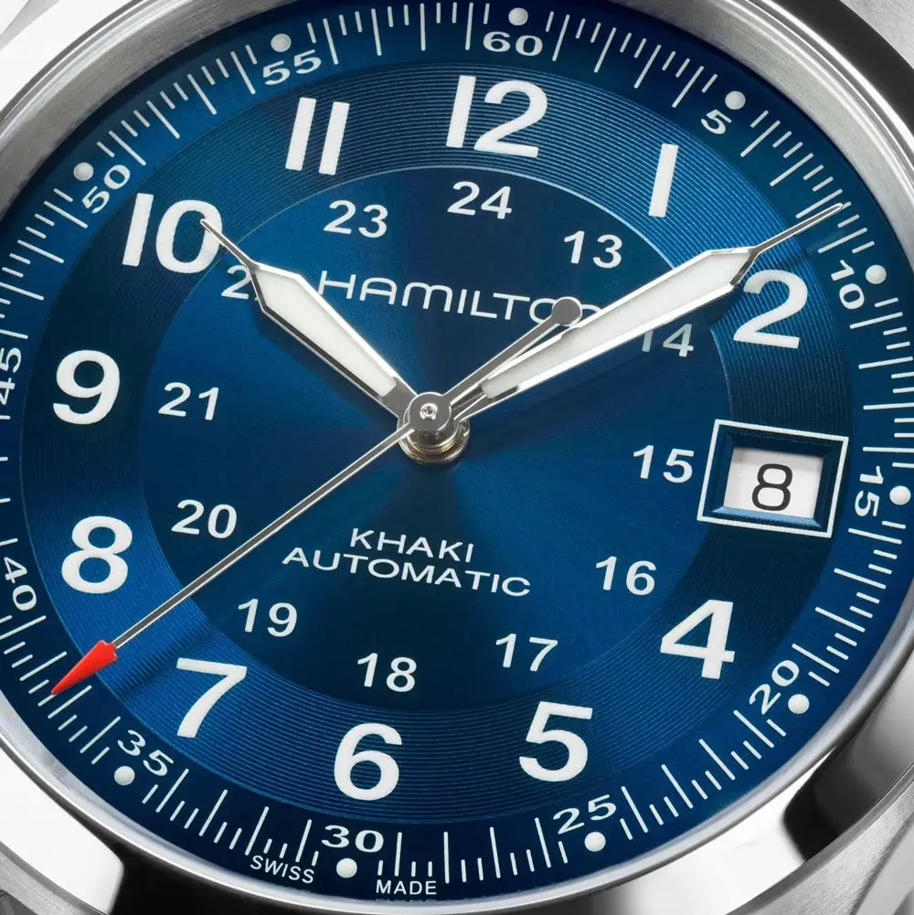 The Hamilton Khaki Field Auto H70455540 blends military heritage with modern precision and everyday versatility. Its compact 38 mm stainless-steel case frames a blue sunburst dial with bold hands and indexes for excellent readability, complemented by a practical date display and 24-hour scale. With its combination of iconic field-watch styling and refined execution, this model fits seamlessly into both urban daily wear and more active outdoor days.