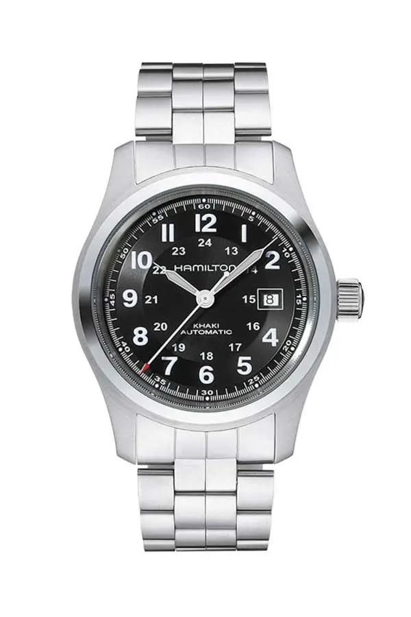 The distinctive Khaki Field watch features a clean dial with bold Arabic numerals, a 24-hour scale and luminescent hands. They are offered in various sizes and designs - from mechanical models with manual winding, to automatic versions, to quartz variants. Cases are often made of steel with a matt finish, complemented by textile, leather or steel bracelets, resistant to everyday wear and tear.