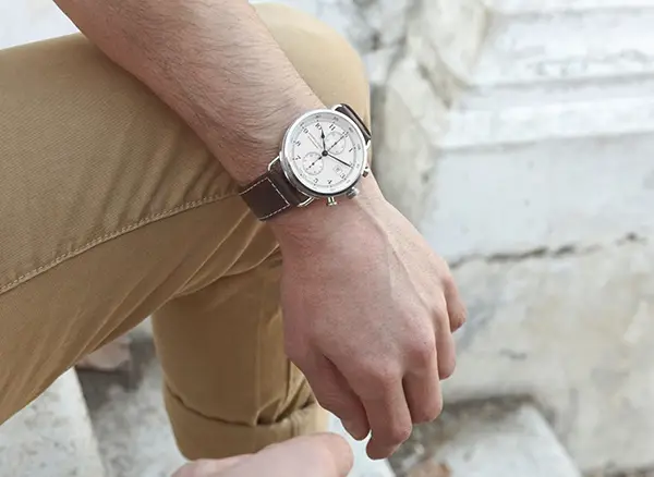 The elegant white analog dial provides a clear time display, as well as chronograph and date functions, ideal for men who appreciate fine details. A stylish brown leather strap with a pin buckle ensures both comfort and security on the wrist.