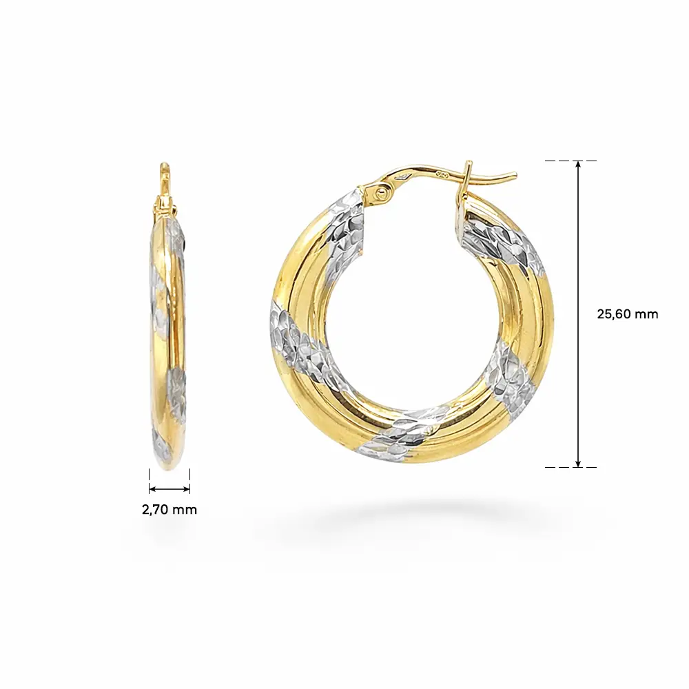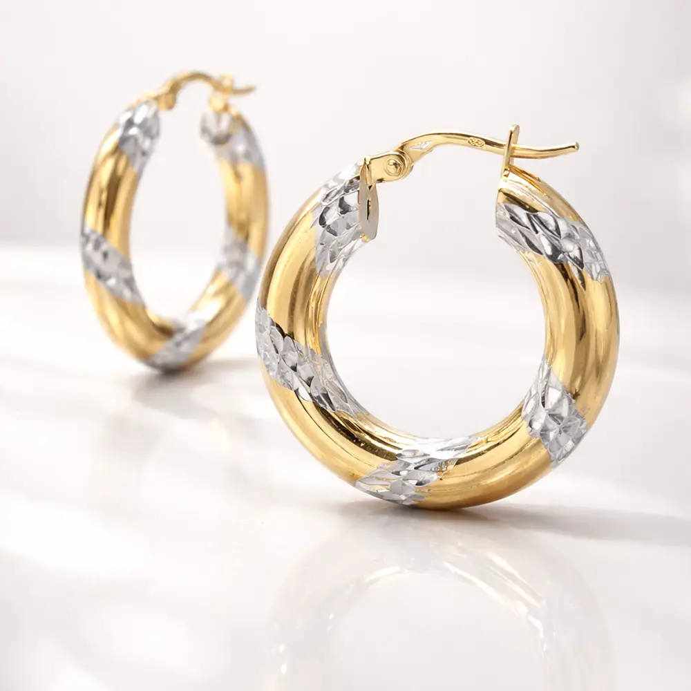 These hoop earrings in combined gold captivate with a harmonious blend of yellow and white gold tones, enhanced by delicate engraved details. The precisely crafted surface creates an elegant contrast between smooth and textured areas, giving the jewelry a dynamic, luxurious, and timeless appearance.