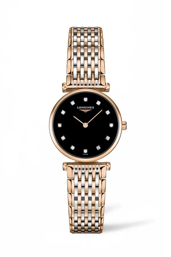 The LONGINES women's watches attract attention with their distinctive design. This elegant watch from the La Grande Classique de Longines line will complement your style. The luxurious combination case with a diameter of 24 mm is complemented by a steel strap with rose gold plating. The round analogue dial with diamonds fits perfectly into the design of the watch. The watch is reliably powered by a quartz movement.