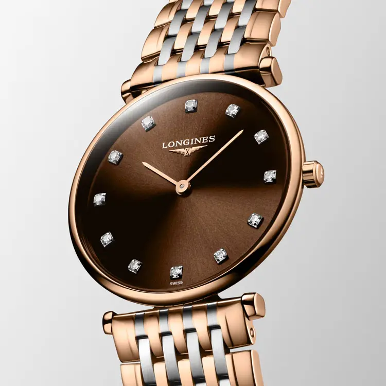 The striking brown dial is adorned with diamond indexes, emphasizing the model’s luxurious character. The elegant analog layout is completed with slender hands in a matching tone.