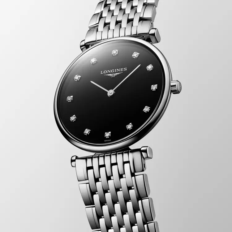On the striking black lacquered dial, 12 diamond indexes (0.081 ct) sparkle with noble brilliance, lending the model a luxurious touch. Slim steel hands complement the minimalist design and underline the timeless character of the La Grande Classique collection.