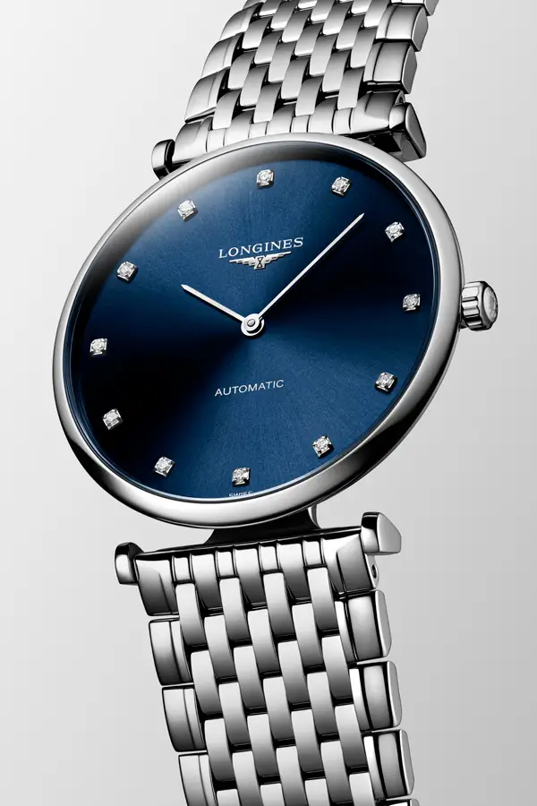The dial in radiant blue sunray finish is adorned with 12 diamond indexes, adding a unique brilliance and noble character. Elegant polished steel hands emphasize the purity of the design, making this model an ideal choice for both formal occasions and everyday elegance.