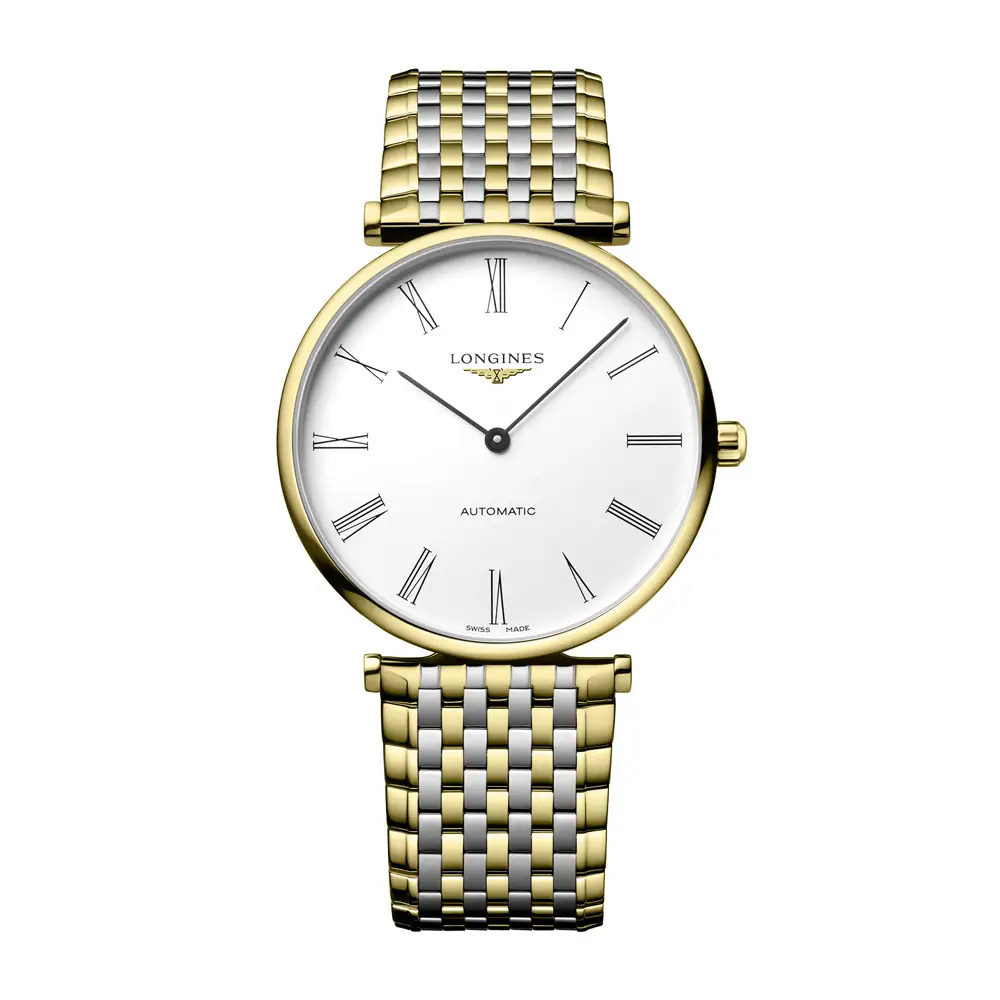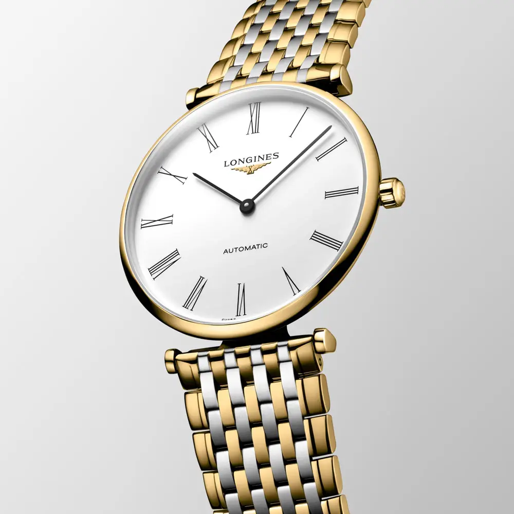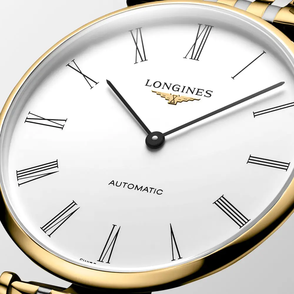 The pure white dial with black Roman numerals and slim hands emphasizes the timeless design of the La Grande Classique collection. A transparent case back reveals the finely decorated movement, a testament to Longines’ Swiss heritage.