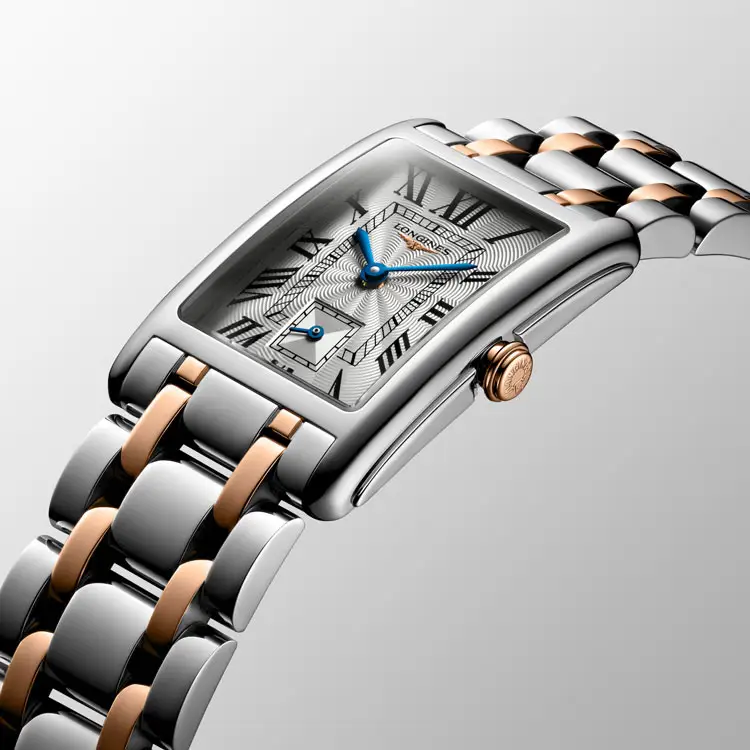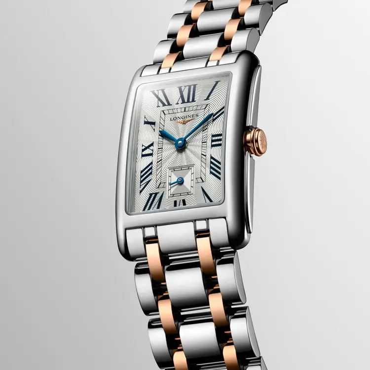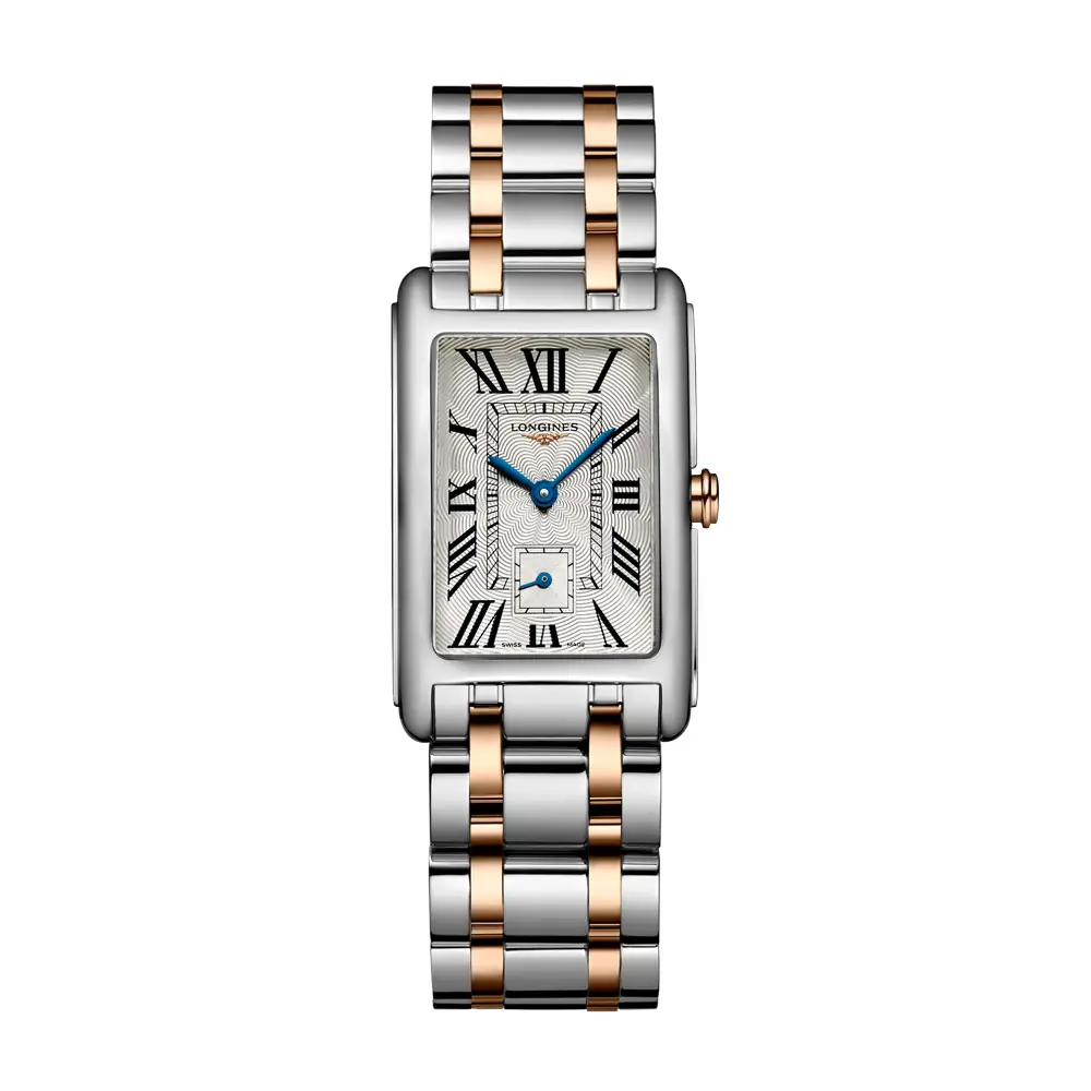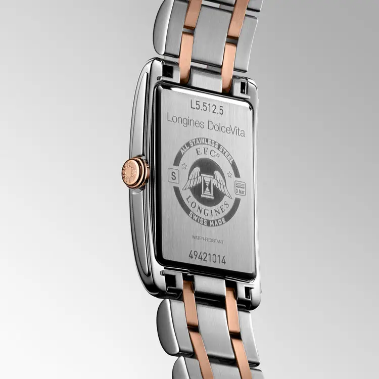 The Longines DolceVita L5.512.5.71.7 is a ladies’ watch of timeless elegance, inspired by the classic rectangular design. Its 23.30 × 37.00 mm stainless steel case is complemented by an 18k rose gold crown, adding a refined and luxurious touch.