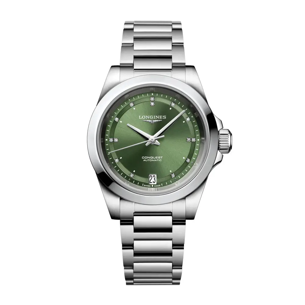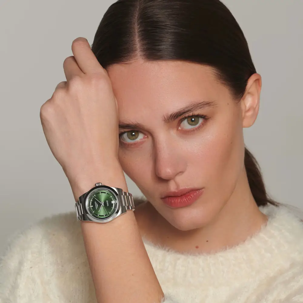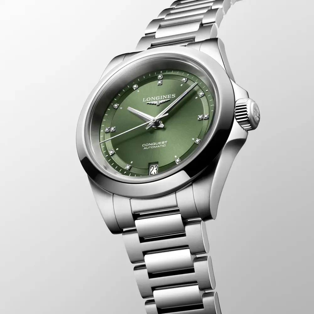 The green sunray dial sparkles with 14 diamond indexes (0.035 ct), complemented by silver-tone luminous hands. A practical date window at 6 o’clock balances aesthetics with functionality, while the fresh dial color adds originality and character.