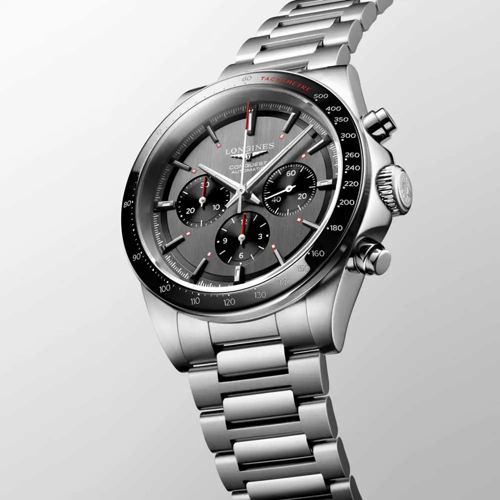 At its heart is the automatic calibre L898 with a 59-hour power reserve, showcasing Swiss horological expertise. The watch is finished with a stainless steel bracelet with a triple safety folding clasp, combining comfort and security. This chronograph is the perfect fusion of performance, elegance, and Longines tradition.