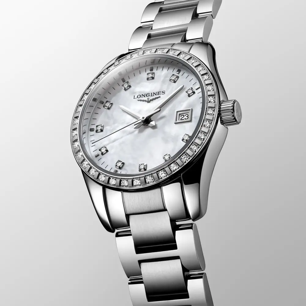 The Longines Conquest Classic L2.286.0.87.6 blends refined feminine elegance with modern functionality, reflecting Longines’ long-standing tradition in crafting precise and stylish timepieces. The 29.5 mm round case made of polished stainless steel appears delicate yet distinctive, thanks to its diamond-set bezel, which adds a luxurious sparkle.