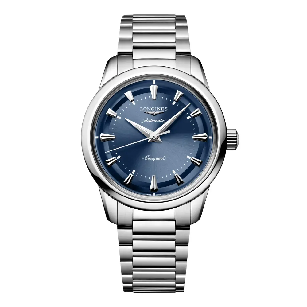 The Longines Conquest Heritage L1.649.4.92.6 blends classic 1950s aesthetics with the technical sophistication of modern watchmaking. Its 38 mm stainless-steel case delivers a balanced and elegant wrist presence suitable for both men and women. The deep blue sunburst dial adds visual depth and refined shine, while the screw-down crown and butterfly clasp highlight the watch’s precise craftsmanship.