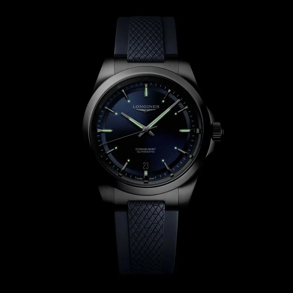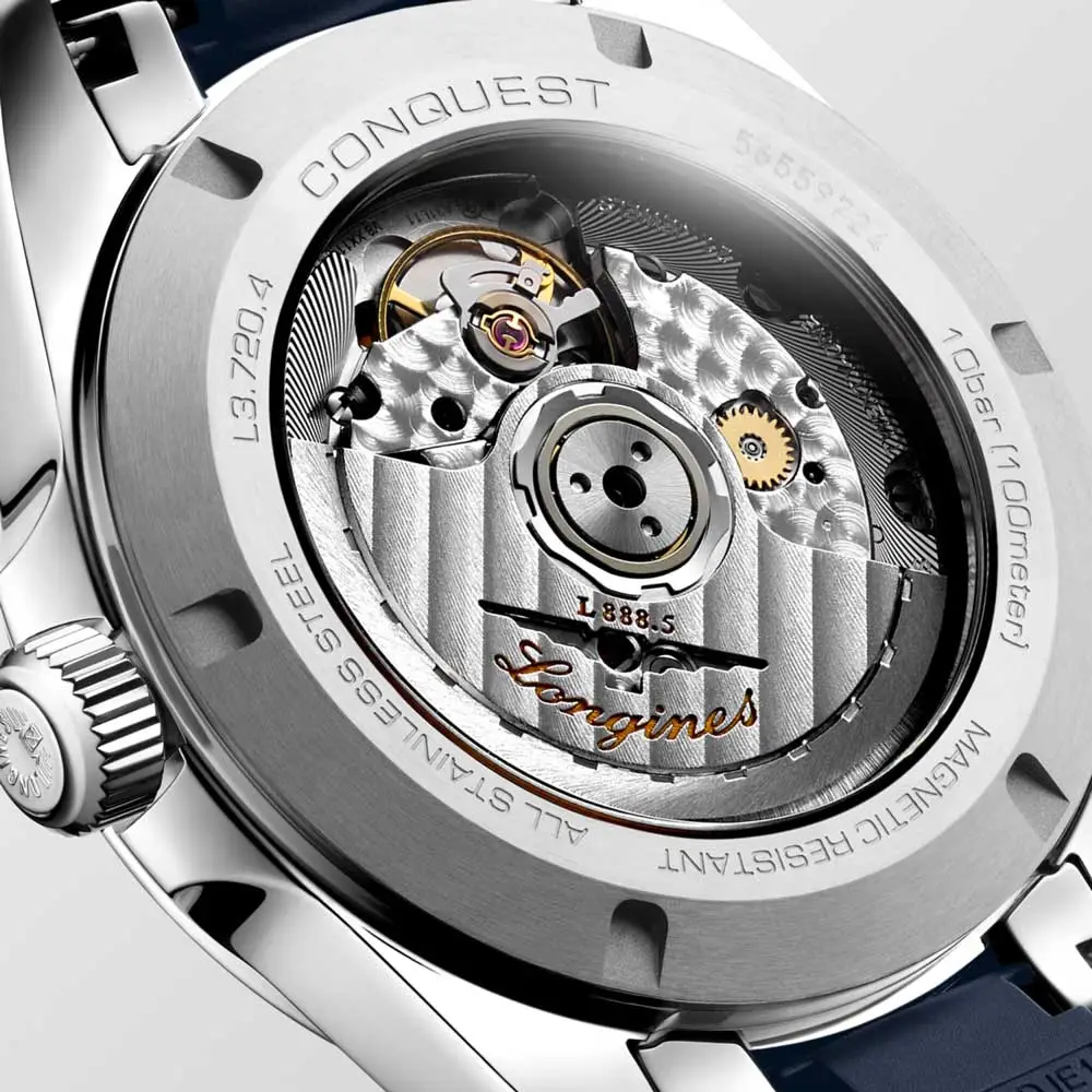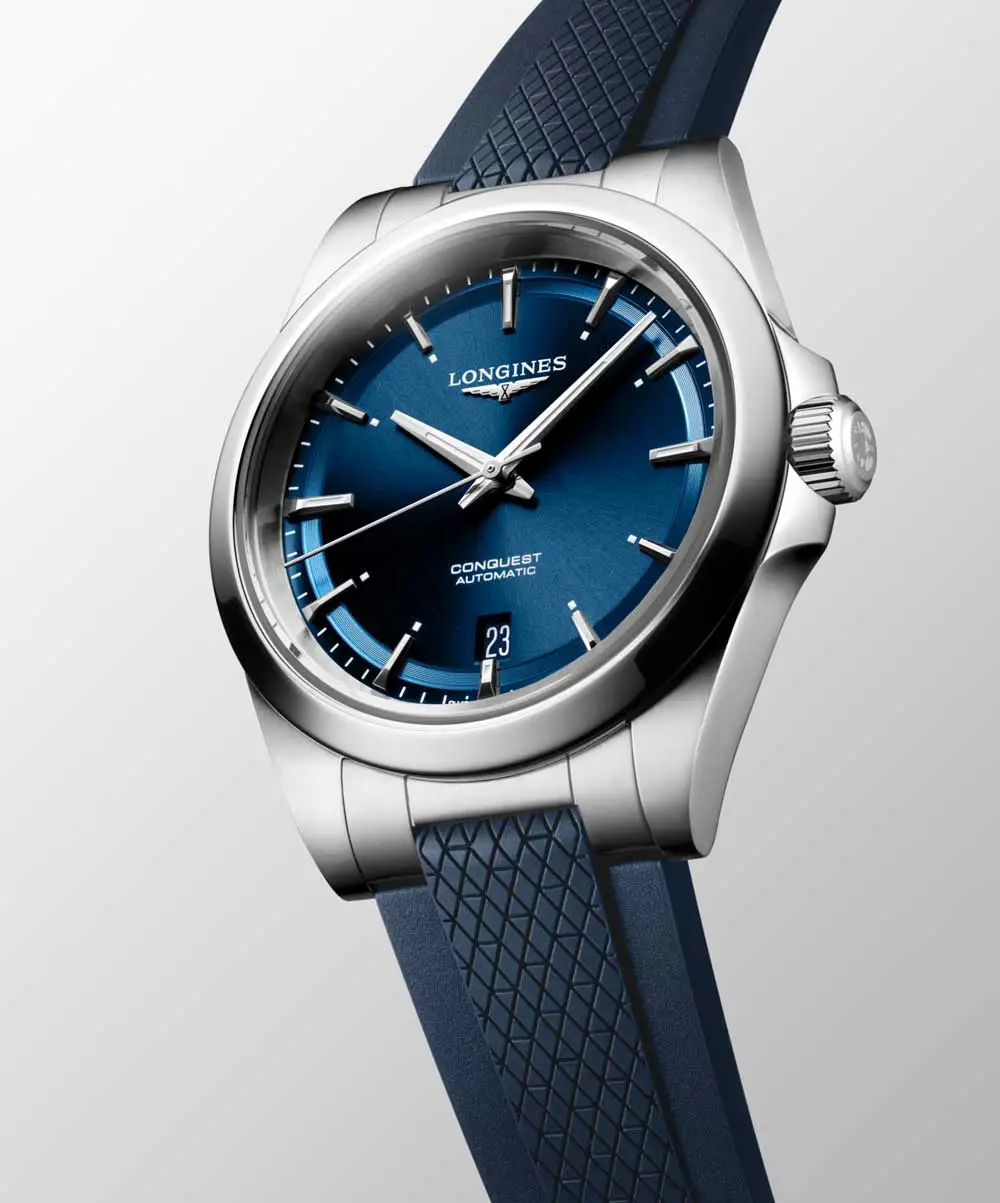 Inside is the powerful L888.5 automatic movement with a power reserve of up to 72 hours, equipped with a silicon thread for greater resistance to magnetic fields. The watch is fitted with a blue rubber strap with a fold-over buckle and micro-adjustment system, which ensures comfort even during sporting activities. The Longines Conquest thus offers reliable performance, timeless style and Swiss precision in one.