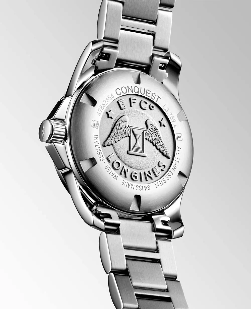 Inside beats the precise quartz calibre L157, delivering high accuracy and carefree operation. Completing the model is a stainless steel bracelet with a triple safety folding clasp, combining comfort, security, and sporty elegance. This watch perfectly embodies the Conquest philosophy – durability, performance, and Swiss tradition.