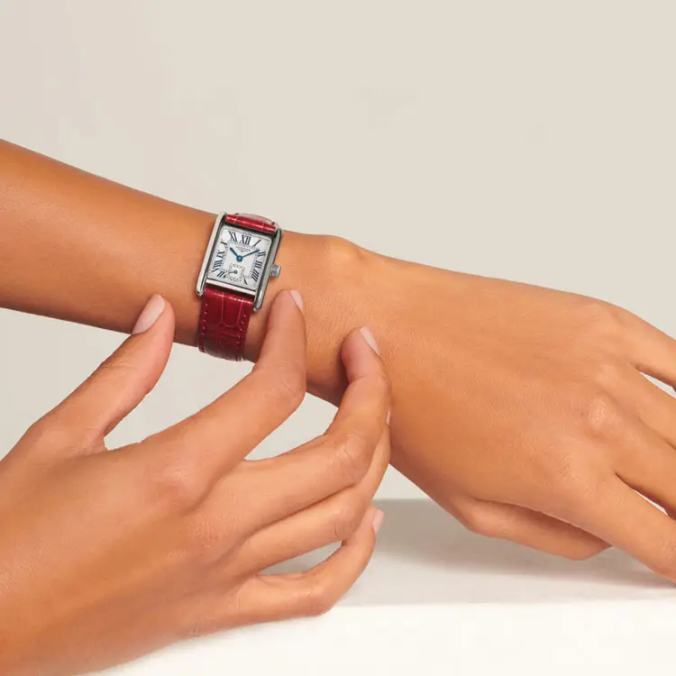 The watch is fitted with a luxurious red alligator leather strap with a classic pin buckle, providing comfortable and secure wear on the wrist.