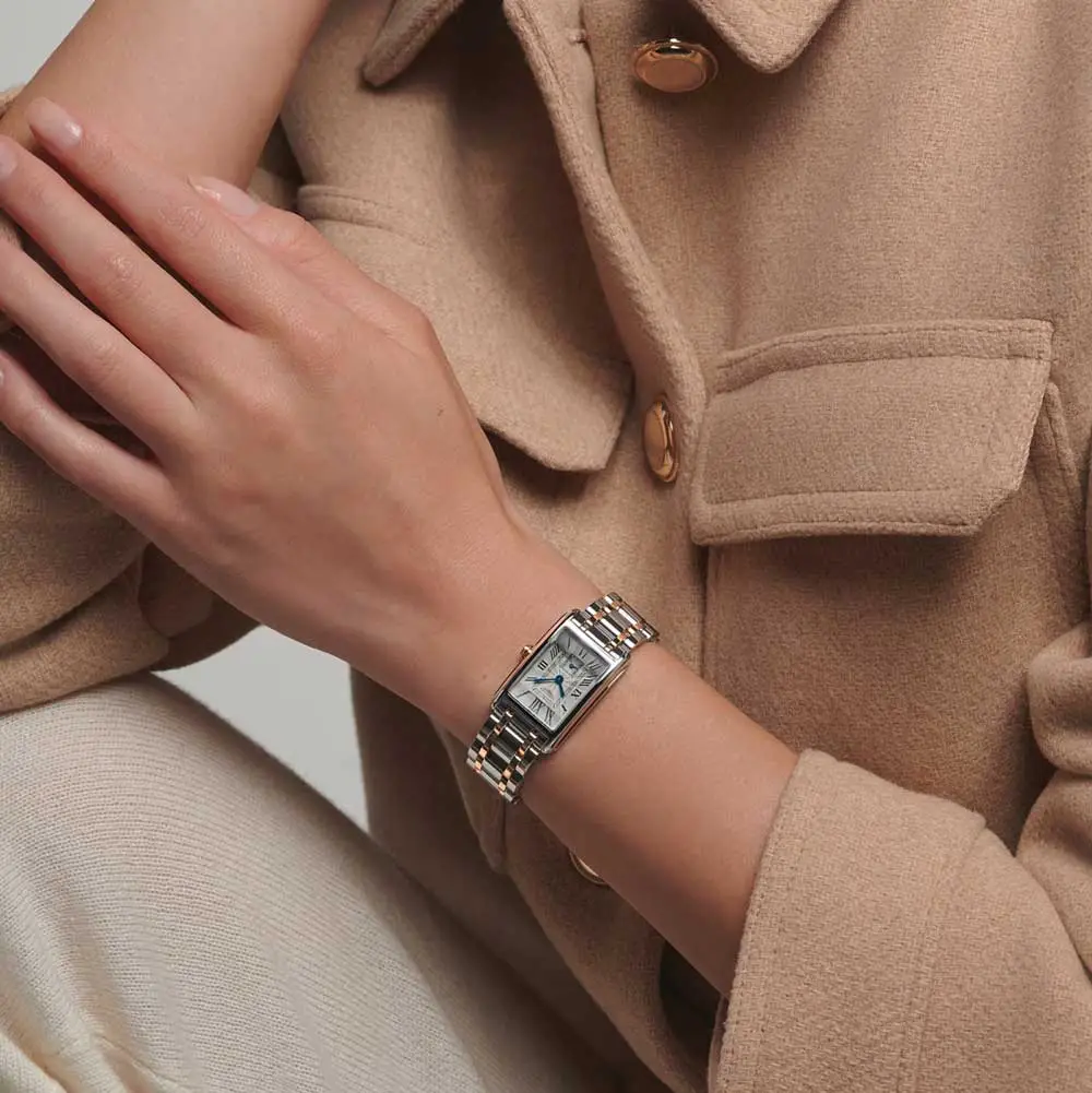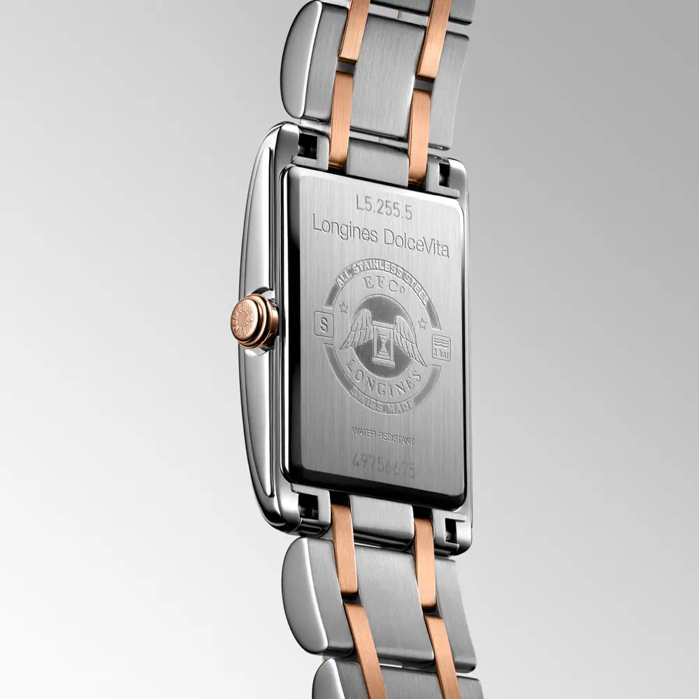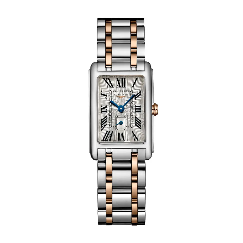 The Longines DolceVita L5.255.5.71.7 is a ladies’ model in an elegant two-tone design, combining the delicacy of the DolceVita collection with timeless aesthetics. Its 20.80 × 32.00 mm stainless steel case is complemented by an 18kt rose gold crown, while the silver “flinqué” dial with Roman numerals and blued steel hands emphasizes the watch’s classic character.