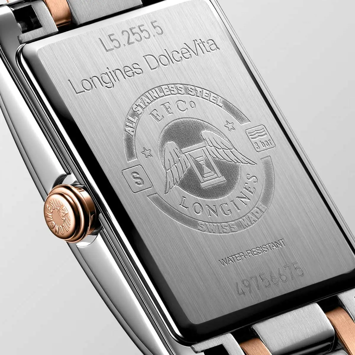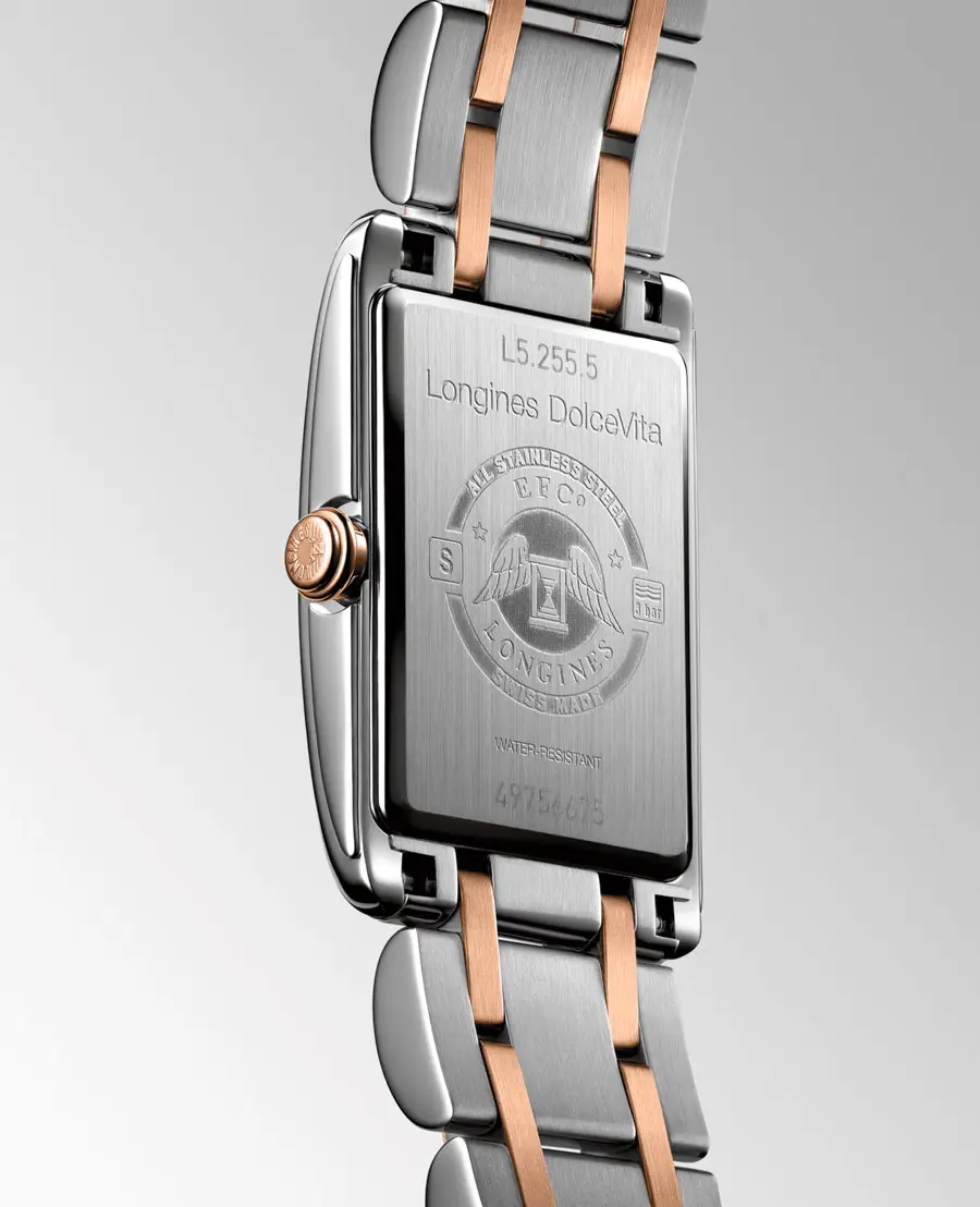The watch is fitted with a two-tone bracelet of steel and rose gold plating, secured by a triple safety folding clasp with push-button release. The DolceVita L5.255.5.75.7 is perfect for women seeking a stylish, sophisticated, and versatile timepiece, suitable for both daily wear and special occasions.