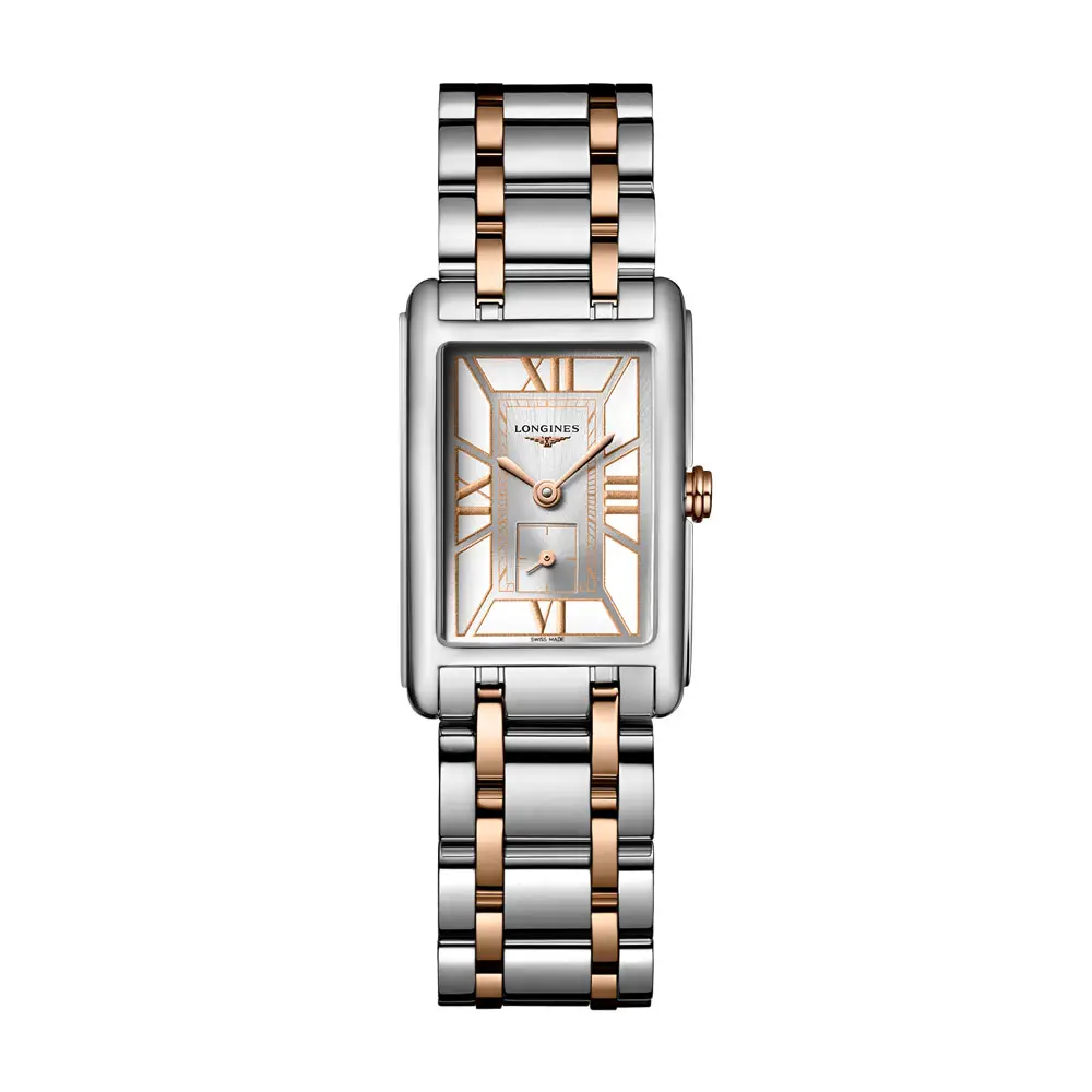 The Longines DolceVita L5.255.5.75.7 is a compact ladies’ model that combines the elegance of the DolceVita collection with a refined two-tone style. Its 20.80 × 32.00 mm stainless steel case is complemented by an 18kt rose gold crown, while the silver “flinqué” dial with Roman numerals and blued steel hands highlights its classic character.