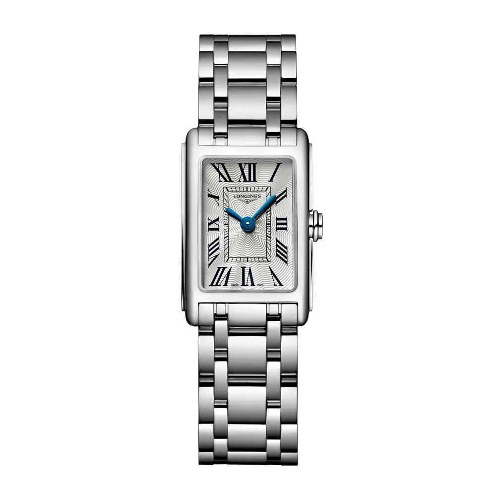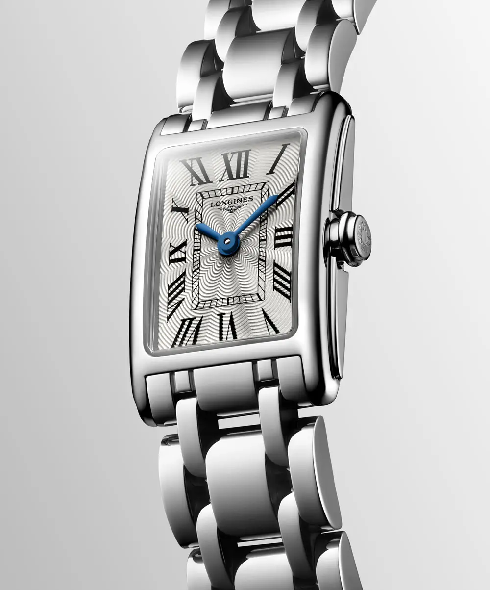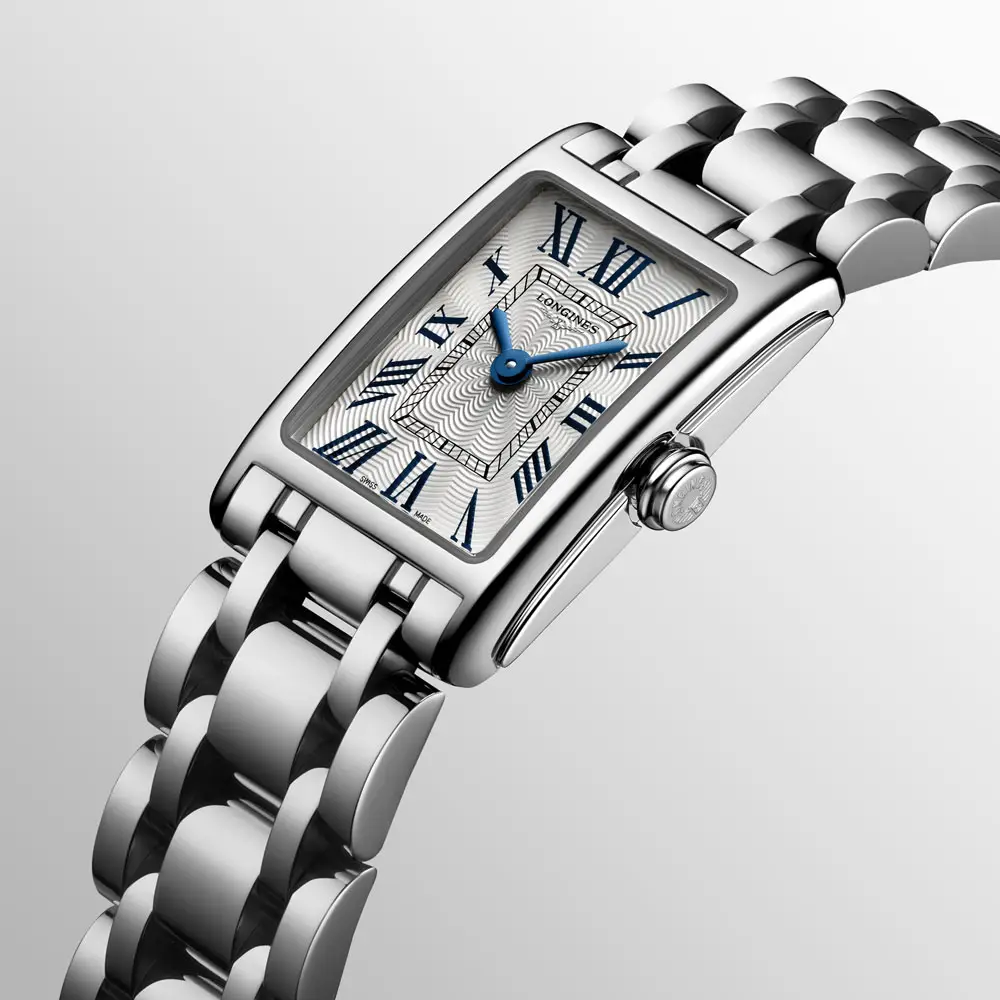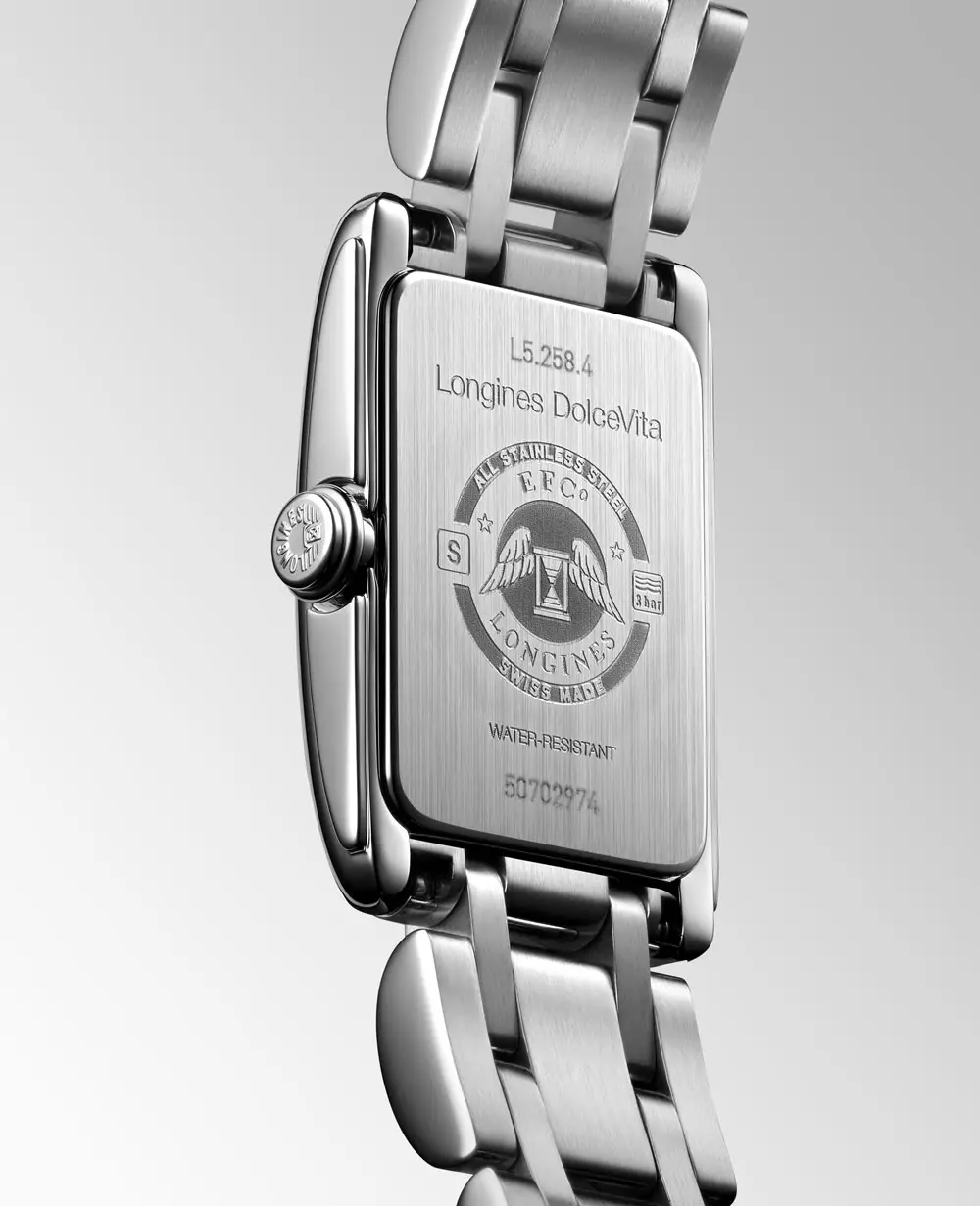 The Longines DolceVita L5.258.4.71.6 is a delicate ladies’ watch that reflects the timeless elegance and feminine charm of the DolceVita collection. Its 17.70 × 27.00 mm stainless steel case frames a silver “flinqué” dial with Roman numerals and blued steel hands, emphasizing a classic aesthetic.